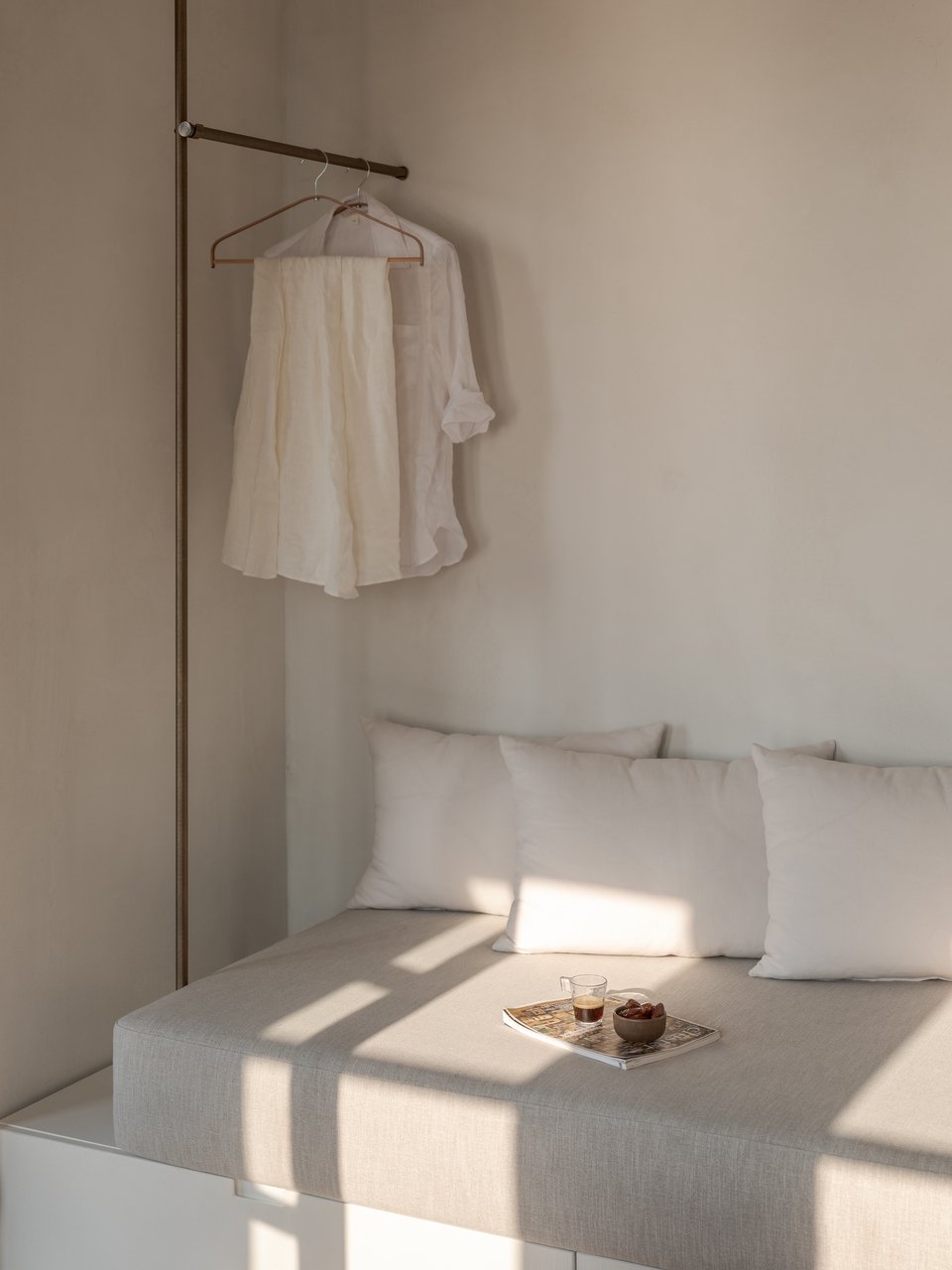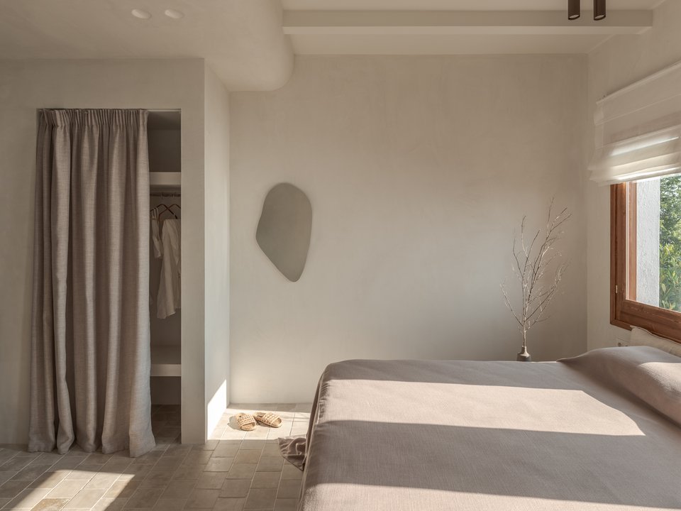 Το εσωτερικό εκπλήσσει, καθώς η παντοκρατορία του λευκού-μπεζ που σπάει μονάχα από κάποιες ξύλινες πινελιές αλλά και απαλούς παστέλ τόνους δημιουργεί ένα σκηνικό ονειρικό, αέρινο και χαλαρωτικό, σαν να βρίσκεται κανείς σε έναν κήπο του zen κάνοντας διαλογισμό. Το σκηνικό της απόλυτης χαλάρωσης συμπληρώνει το φυσικό γαλακτερό φως που εισβάλλει στο εσωτερικό από τα παράθυρα, αναδεικνύοντας κάθε γωνιά, δημιουργώντας ευεξία.