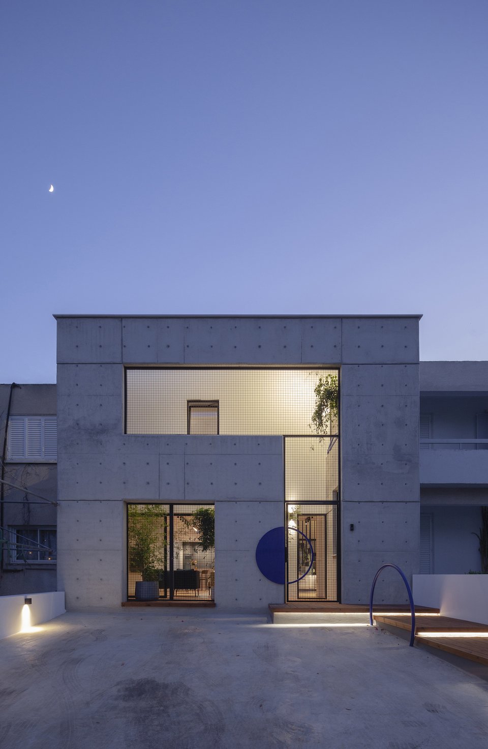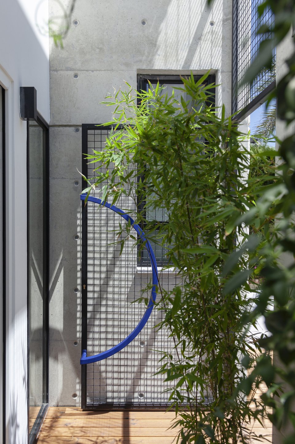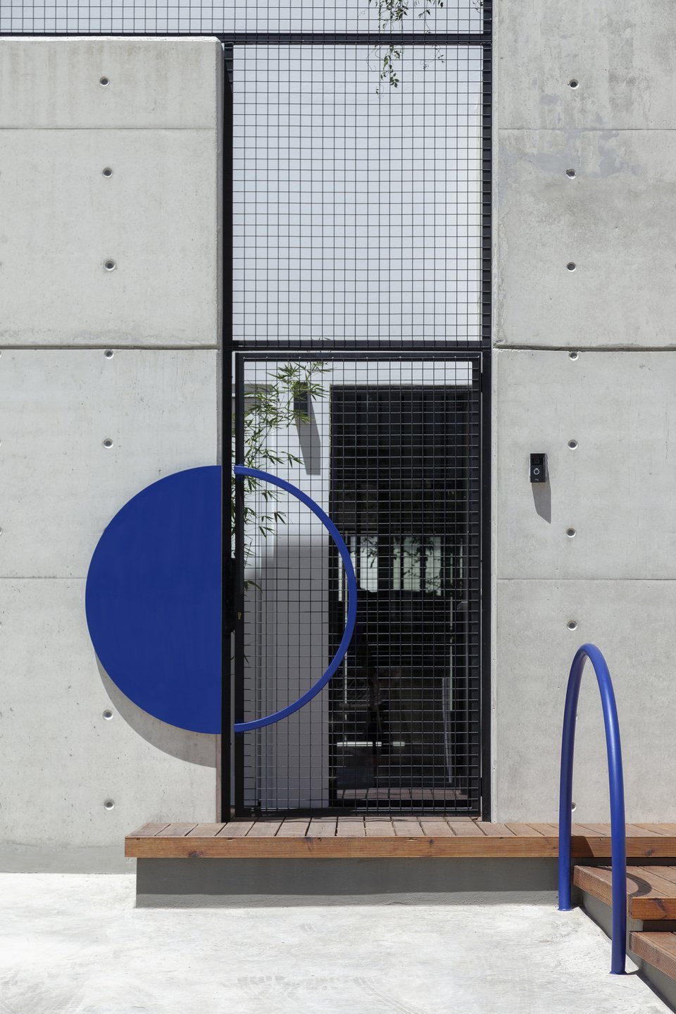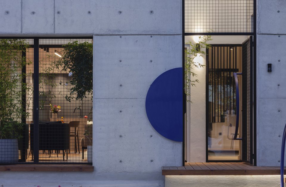 Η στιβαρή πρόσοψη από εμφανές μπετόν αποκτά έναν πιο ανάλαφρο χαρακτήρα χάρη στα μεταλλικά πλέγματα που ντύνουν την πόρτα και τα παράθυρα. Ένα ζωηρό μπλε χρώμα τους χαρίζει ποπ στυλ, τραβώντας τα βλέμματα και κλέβοντας τις εντυπώσεις.