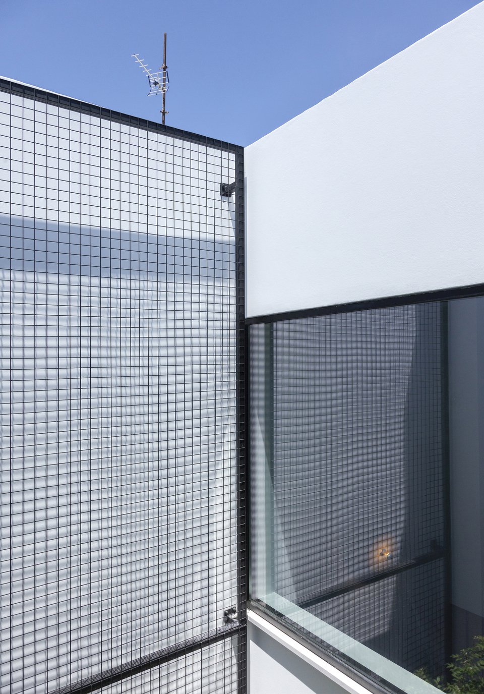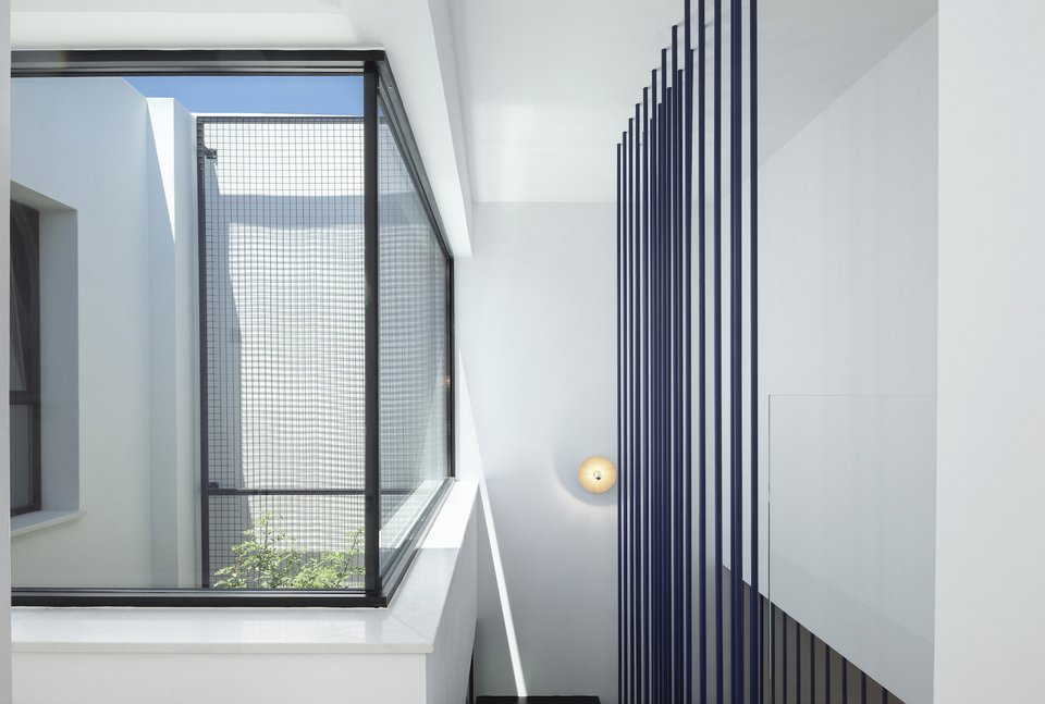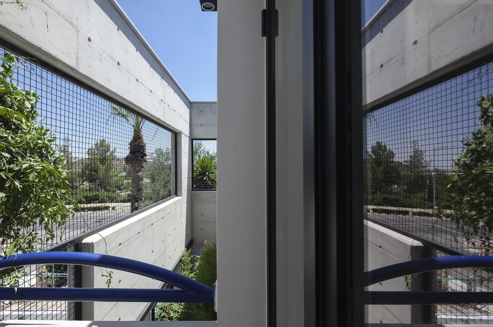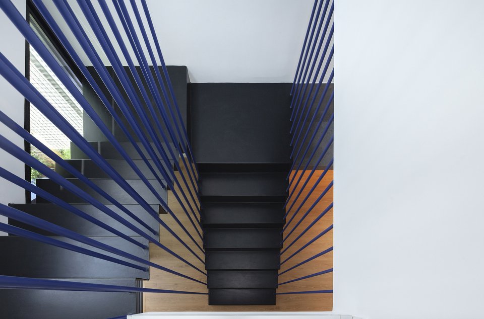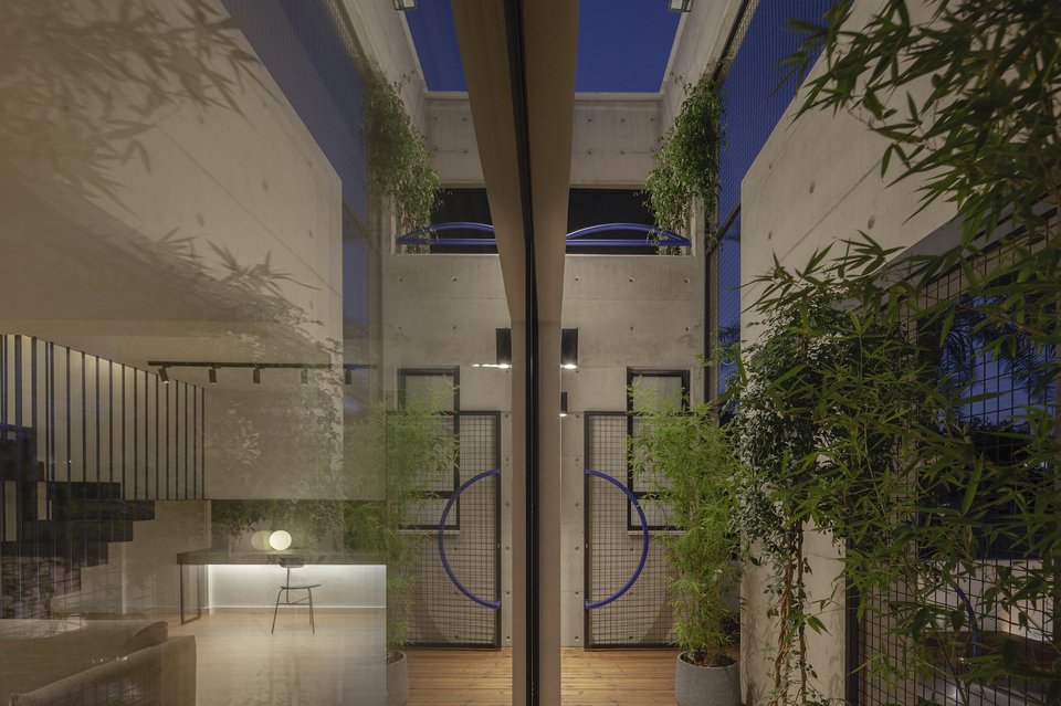 Η στιβαρή πρόσοψη από εμφανές μπετόν αποκτά έναν πιο ανάλαφρο χαρακτήρα χάρη στα μεταλλικά πλέγματα που ντύνουν την πόρτα και τα παράθυρα. Ένα ζωηρό μπλε χρώμα τους χαρίζει ποπ στυλ, τραβώντας τα βλέμματα και κλέβοντας τις εντυπώσεις.