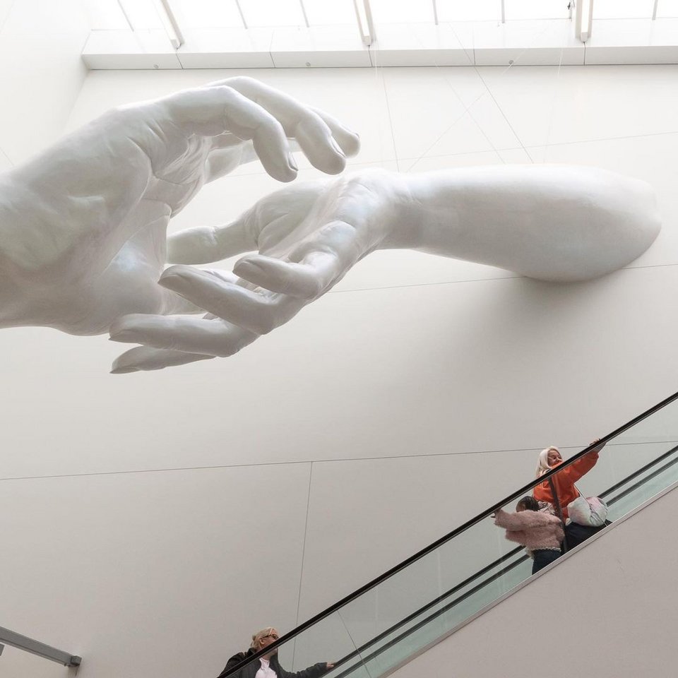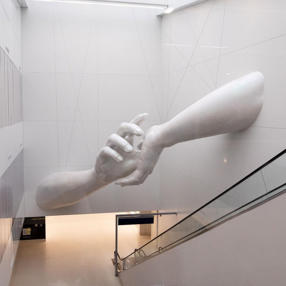 Αναδυόμενοι από τους τοίχους αίθουσας με κυλιόμενες σκάλες είναι οι δύο πελώριοι βραχίονες - περίπου 8,3 μέτρα και 9,5 μέτρα - και τείνουν ο ένας προς τον άλλον λες και πρόκειται να δώσουν τα χέρια.