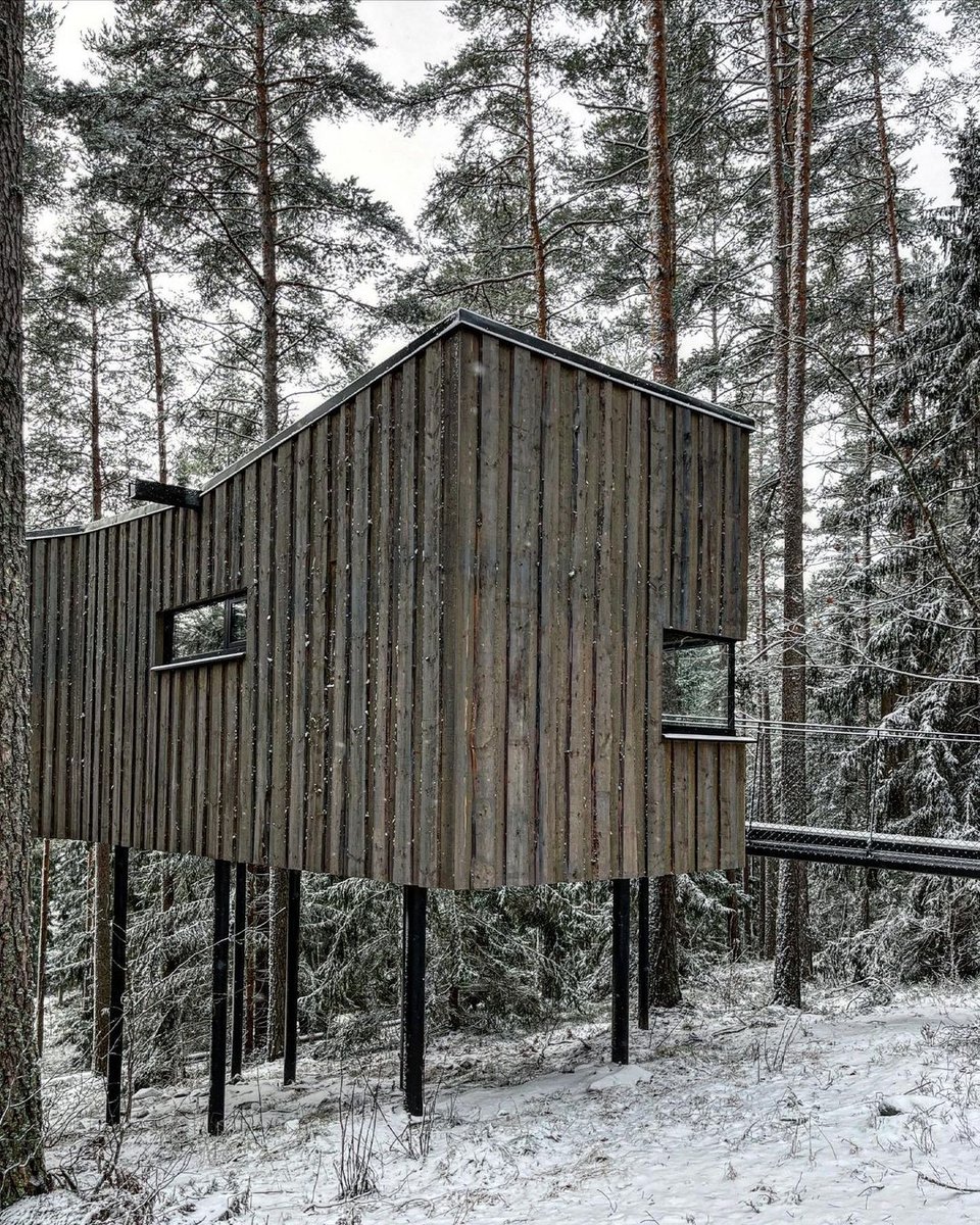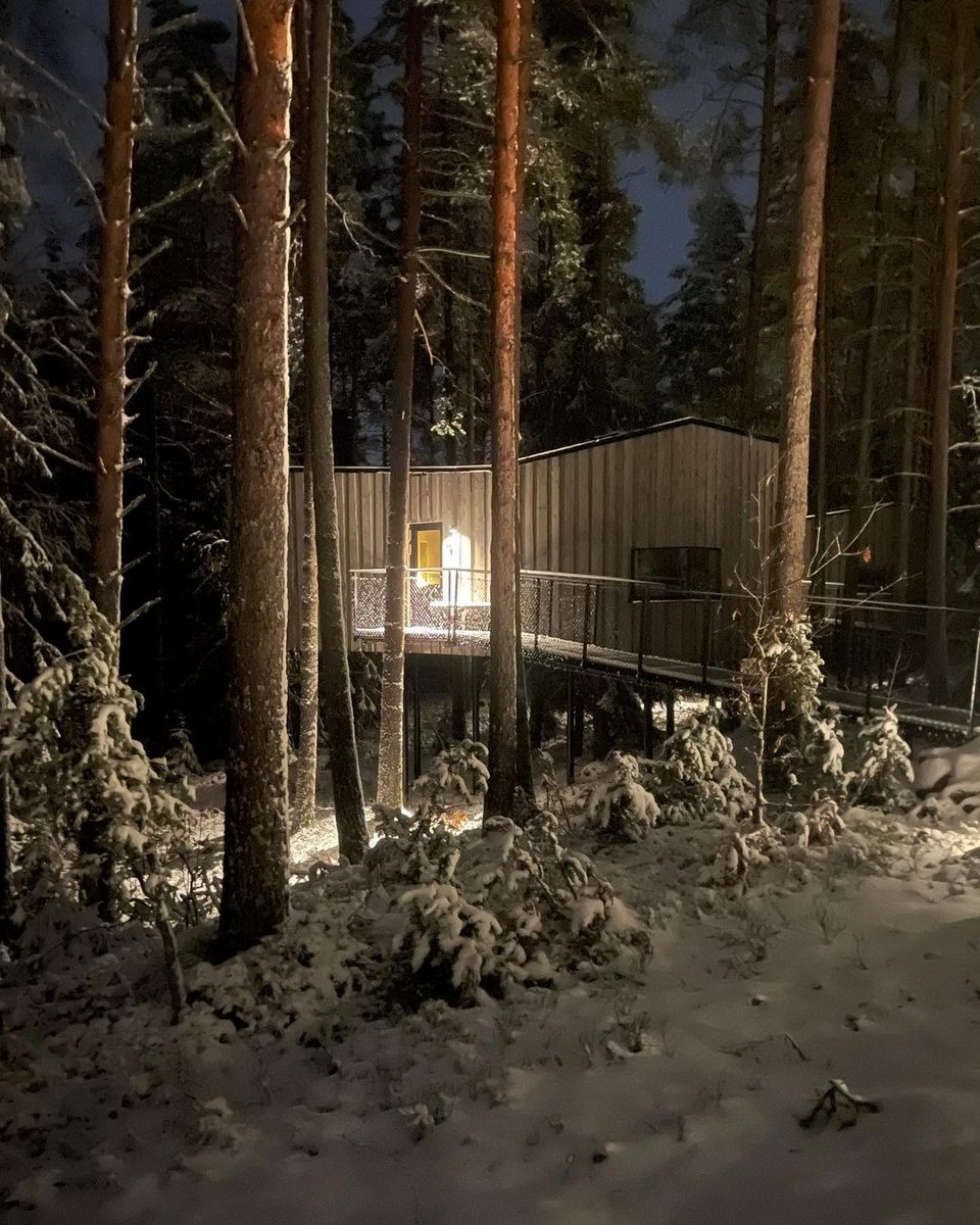 Οι καλύβες είναι τοποθετημένες πάνω σε μεταλλικούς ορθοστάτες για να δίνουν στους επισκέπτες την αίσθηση ότι βρίσκονται κάτω από ομπρέλα δέντρων στη Σουηδία.