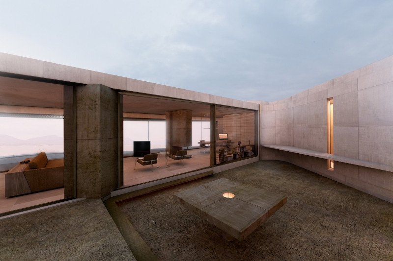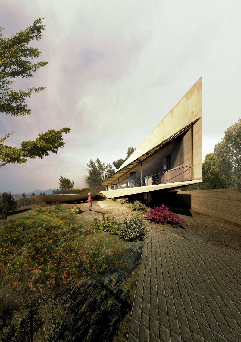 Η δομή από οπλισμένο σκυρόδεμα σε γήινη απόχρωση δίνει σε ολόκληρο το σπίτι την αίσθηση της τραχύτητας, επιβεβαιώνοντας τη γλυπτική απόδοση που έχουν όλα τα έργα του αρχιτεκτονικού γραφείου Tense Architecture Network. Εδώ όμως βρίσκεται με φόντο ένα υπέροχο μεσογειακό τοπίο.