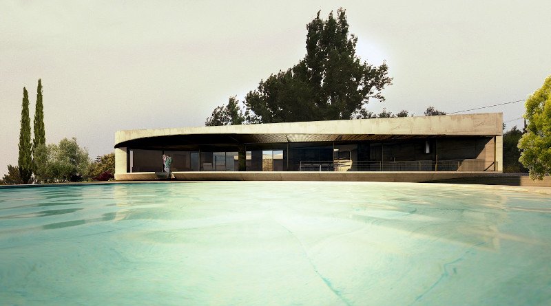Κι ενώ το σπίτι μπορεί να φαίνεται γωνιακό, οι εξωτερικοί χώροι και ο εξωραϊσμός, είναι πιο μαλακός. Μια καμπυλωτή βεράντα κατευθείαν από το σαλόνι ανταποκρίνεται στις τοπογραφικές γραμμές του εδάφους και οδηγεί στην εντυπωσιακή πισίνα. Μάλιστα με μια πρώτη ματιά η συγκεκριμένη πισίνα θυμίζει έργα των μοντερνιστών του 20ου αιώνα.