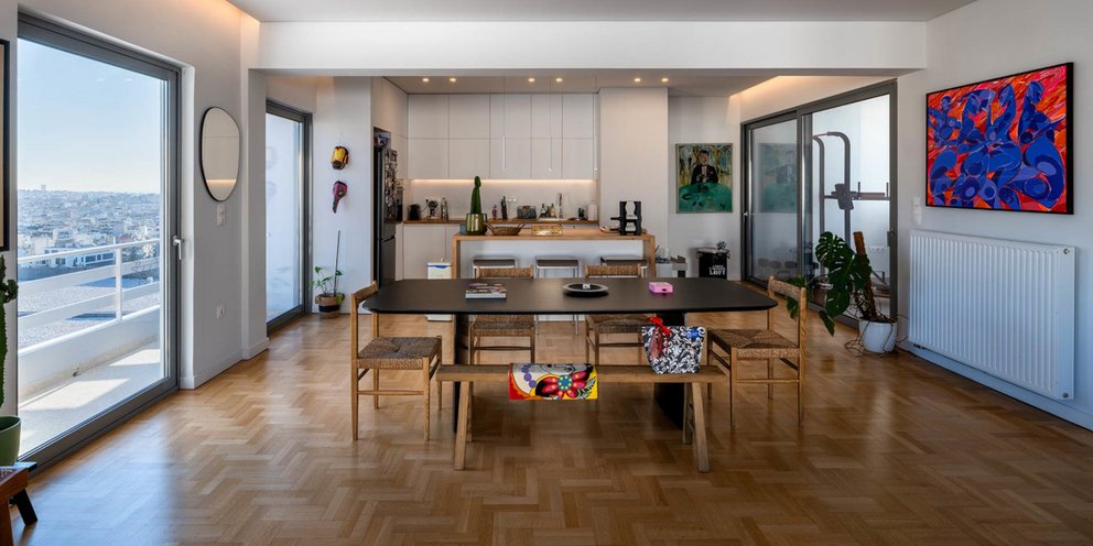 Το πιο εντυπωσιακό στοιχείο; Η θέα στην Ακρόπολη, που δεν αποτελεί απλώς προνόμιο, αλλά ενσωματώνεται οργανικά στον σχεδιασμό, «καδράροντας» την καθημερινότητα των ενοίκων και μετατρέποντας κάθε σημείο του σπιτιού σε εμπειρία.
