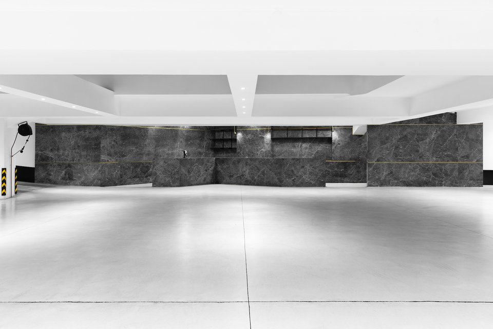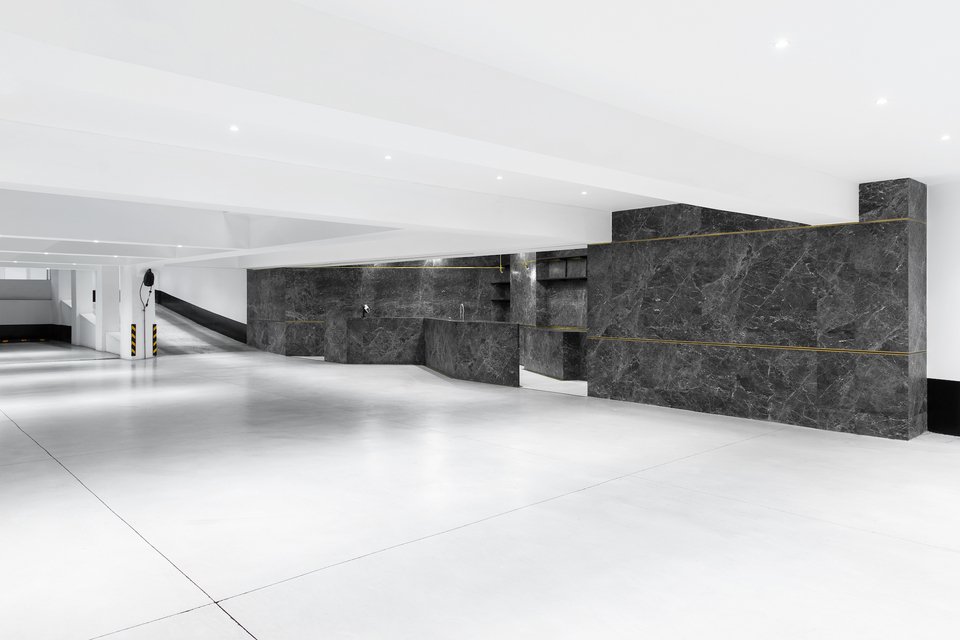 Μόλις η φωτισμένη δραματικά μεγάλη γκαραζόπορτα ανοίξει ένας κατάλευκος εντυπωσιακός χώρος φωτίζει το γκρίζο αστικό τοπίο της οδού Σόλωνος. Ο περαστικός ή ο επισκέπτης ξαφνικά βρίσκεται μέσα σε κάτι που θυμίζει είτε αφαιρετικό industrial σκηνικό από μπαλέτο της Λυρικής είτε μια μίνιμαλ μπουτίκ οίκου μόδας. Η ασπρόμαυρη παλέτα αναδεικνύεται χάρη σε ένα μεγάλο διάτρητο τοίχο και έναν εντυπωσιακό μοντέρνο πολυέλαιο που δεσπόζει μπροστά του. Στα δεξιά υπάρχει μια μαύρη σκάλα με αυστηρή γεωμετρία και μια μαρμάρινη ρεσεψιόν με προθήκες και λείες λαμπερές επιφάνειες, ενώ στο κέντρο βρίσκεται η πλατφόρμα που οδηγεί στους επάνω ορόφους του υπέργειου γκαράζ.