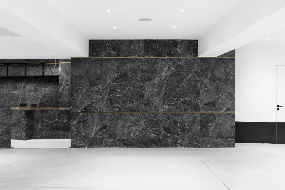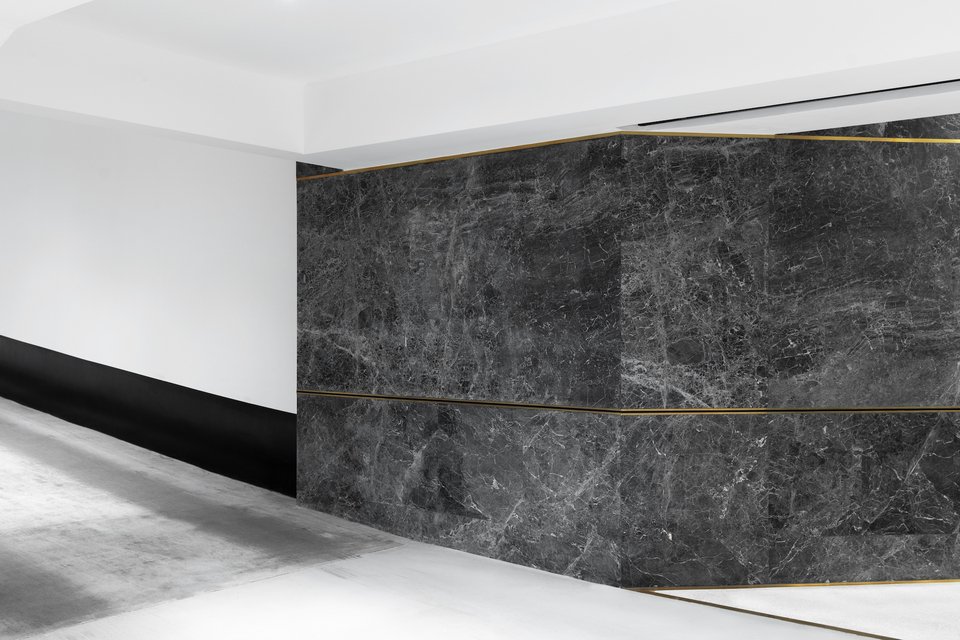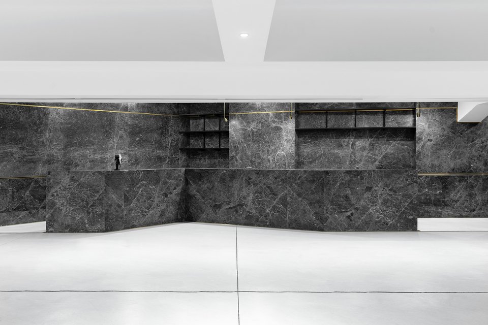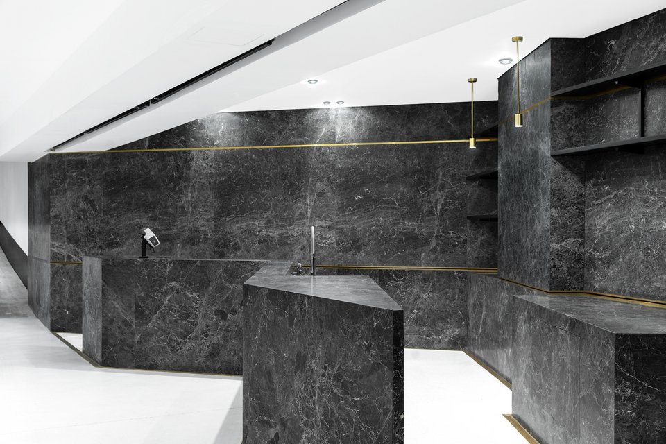 «Αποφασίσαμε να τον χωροθετήσουμε στο σημείο που πριν υπήρχαν τα γραφεία και το λογιστήριο της επιχείρησης, δημιουργώντας μια ανοιχτή κάτοψη και αξιοποιώντας το τριγωνικό σχήμα του χώρου στο σημείο αυτό. Προκειμένου να ενισχύσουμε την ορατότητα της ζώνης αυτής και να την κάνουμε εμφανή ακόμα και από μακριά ως το σημείο υποδοχής και αλληλεπίδρασης με το προσωπικό του χώρου, χρησιμοποιήσαμε μια έντονη αντίθεση στα υλικά: λευκό για όλο το χώρο κυκλοφορίας και στάθμευσης του ισογείου, και φυσικό μαύρο μάρμαρο Δαμάστας με λεπτομέρειες ορείχαλκου για το χώρο της ρεσεψιόν. Η χρήση αυτής της ισχυρής και βαθιάς υλικότητας για τον μικρό χώρο της ρεσεψιόν αποτέλεσε κομβική επιλογή για το συνολικό όραμα του έργου, με την δημιουργία τελικά ενός εμφανούς πόλου έλξης εν είδη κοσμήματος στο κέντρο του τεράστιου αυτού χώρου στάθμευσης», συμπληρώνουν οι νεαροί, βραβευμένοι δημιουργοί.