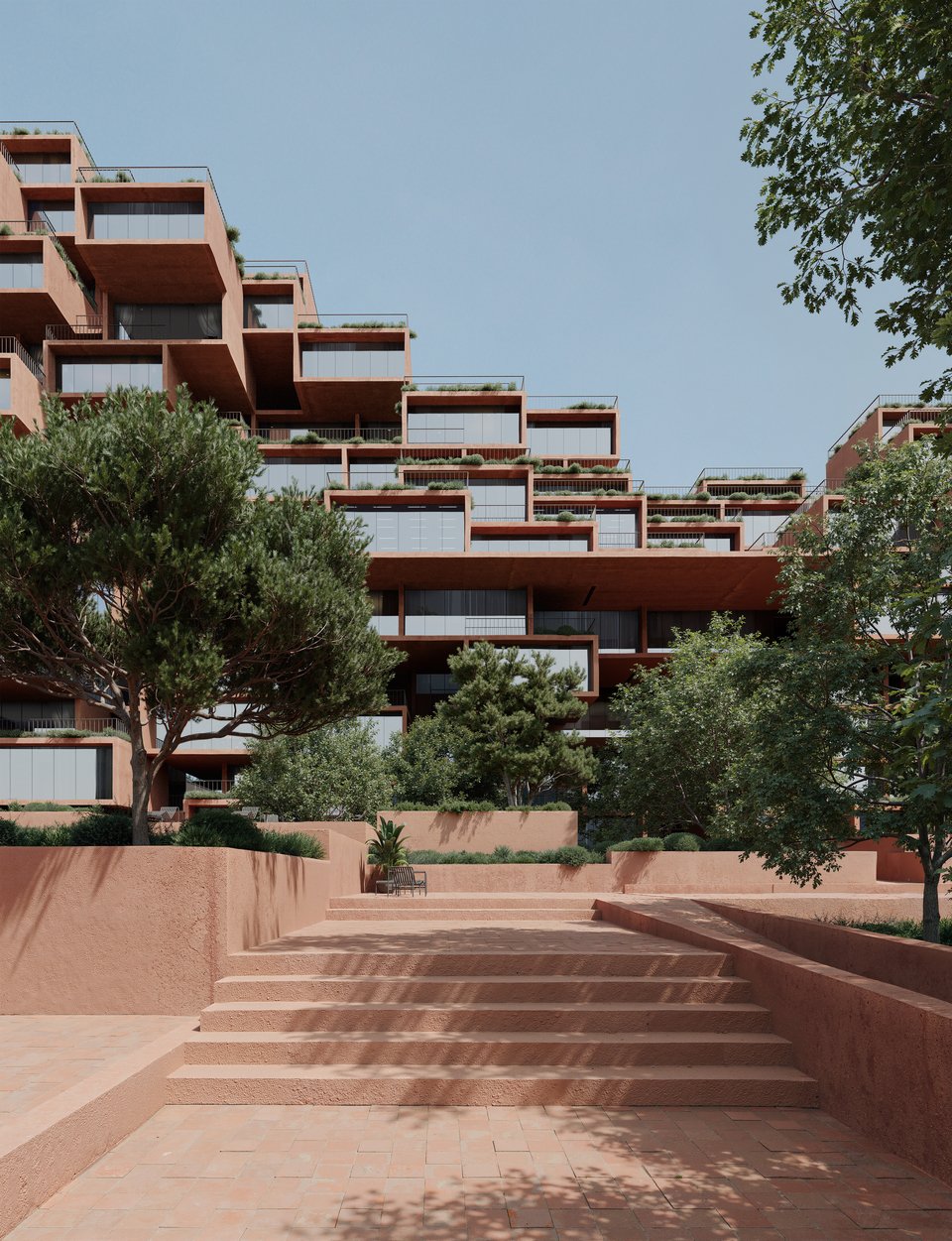 Θυμίζοντας τις πεζούλες των νησιών, τις αναβαθμίδες που αξιοποιούν για καλλιέργεια ακόμα και τις πιο απότομες πλαγιές, οι κατάφυτες ταράτσες αυτού του συγκροτήματος φέρνουν την ευεξία από την επαφή με τη φύση στην καθημερινότητα των κατοίκων, οι οποίοι ζώντας σε ένα τέτοιο σπίτι θα αισθάνονται σαν να βρίσκονται στο ισόγειο μιας μονοκατοικίας με κήπο ακόμα κι αν βρίσκονται, φέρ' ειπείν, στον 7ο ή 12 όροφο μιας ογκώδους πολυκατοικίας.