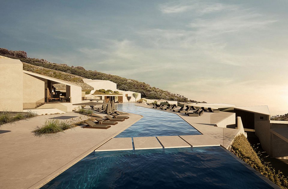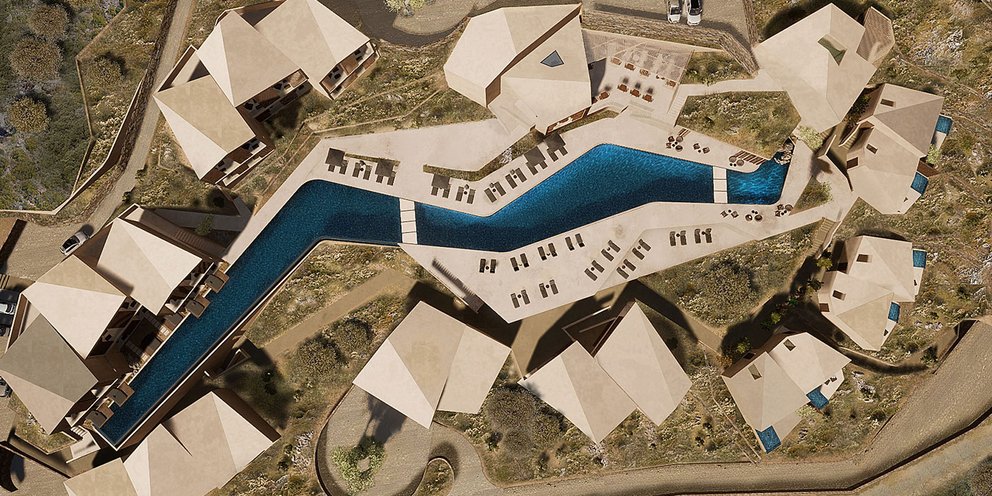 Όντως, παρατηρώντας τις 3D φωτορεαλιστικές μακέτες του συγκεκριμένου project βλέπουμε ότι με μία γήινη παλέτα στις αποχρώσεις του τοπίου, οι αρχιτέκτονες Louis Barault, Ελισανία Μιχαλοπούλου, Αλίκη Σιγάλα, Στέλλα Μητσογιάννη και Ξένια Μπουραντά, έχουν καταφέρει να δημιουργήσουν ένα επιβλητικό ξενοδοχειακό συγκρότημα από αυτόνομες πολυτελείς κατοικίες-σουίτες, που τις χαρακτηρίζουν οι αιχμηρές γωνίες και τα γεωμετρικά σχήματα, χωρίς να διαταράσσουν την αρμονία του τοπίου.
