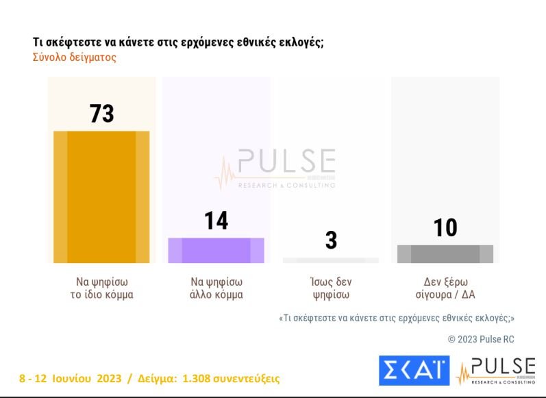 Σχεδόν 3 στους 4 ψηφοφόρους όλων των κομμάτων, που ισοδυναμεί με ποσοστό 73%,σκέφτονται να ψηφίσουν ό,τι προτίμησαν και στις εκλογές της Μαΐου, ενώ το 14% δηλώνει ότι θα κάνει άλλη επιλογή. Το 3% απάντησε ότι ίσως δεν πάει να ψηφίσει καθόλου αυτήν τη φορά, ενώ στο 10% είναι εκείνοι που επιλέγουν ΔΞ/ΔΑ.