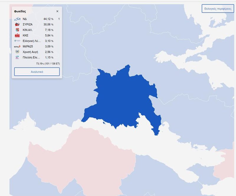Στην μονοεδρική της Φωκίδος η ΝΔ συγκεντρώνει 44,12% έναντι 30,06% του ΣΥΡΙΖΑ. Εκλέγεται ο Ιωάννης Μπουγάς.