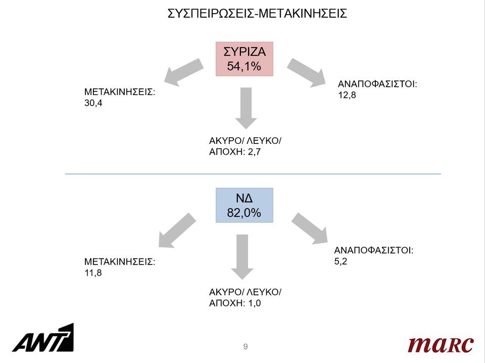 Στην έρευνα της Marc, ο ΣΥΡΙΖΑ έχει κολλήσει -δύο 24ωρα πριν ανοίξουν οι κάλπες -στο 54,1% ως προς την συσπείρωση των ψηφοφόρων του. Οι μετακινήσεις του ΣΥΡΙΖΑ προς άλλα κόμματα είναι 30,4%. Οπως διευκρίνισε στο κεντρικό δελτίο ειδήσεων του ΑΝΤ-1 και στον Νίκο Χατζηνικολάου, ο διευθύνων σύμβουλος της Marc Θωμάς Γεράκης, τουλάχιστον οι μισοί από αυτούς, πηγαίνουν απ' ευθείας στην ΝΔ.