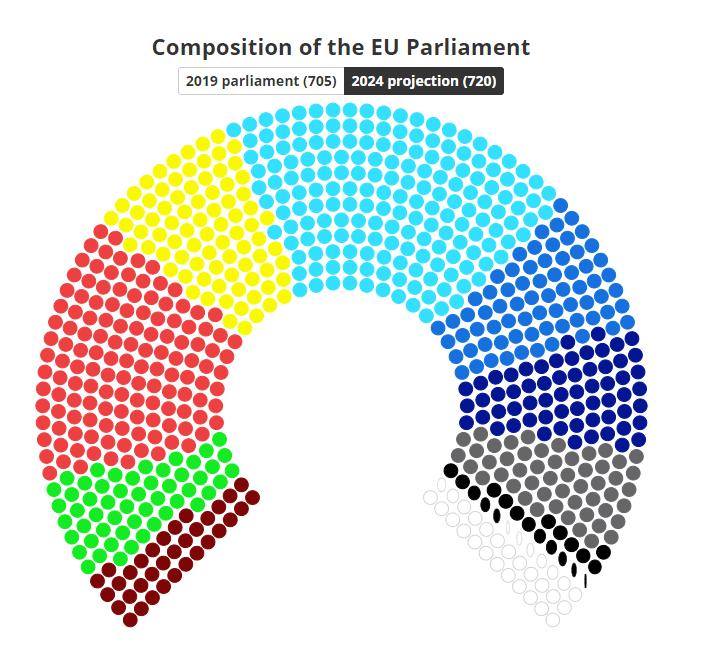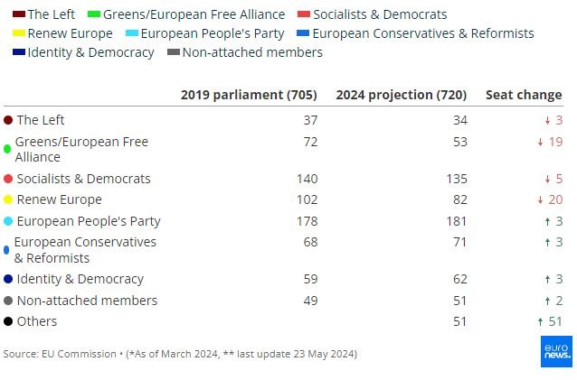 Αναλυτικά, το Ευρωπαϊκό Λαϊκό Κόμμα (ΕΛΚ) αναμένεται να έχει 181 έδρες στο Ευρωκοινοβούλιο, δεύτεροι είναι οι Σοσιαλδημοκράτες με 135, τρίτοι οι «Ανανεωτές» με 82, τέταρτοι με 71 έδρες οι Ευρωπαίοι Συντηρητικοί και Μεταρρυθμιστές, έκτη με 62 η Κοινοβουλευτική Ομάδα Ταυτότητας και Δημοκρατίας, έβδομοι με 53 οι «Πράσινοι», με 51 έδρες οι ανεξάρτητοι ευρωβουλευτές, με 34 η «Αριστερά» και με 50 οι βουλευτές που δεν ανήκουν σε μια από τις ευρύτερες πολιτικές ομάδες της Ευρωβουλής.