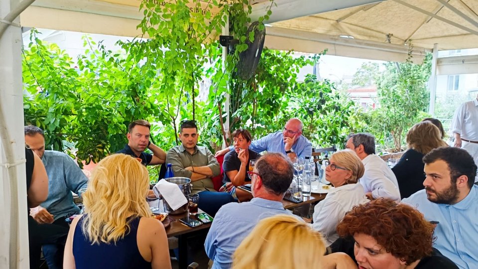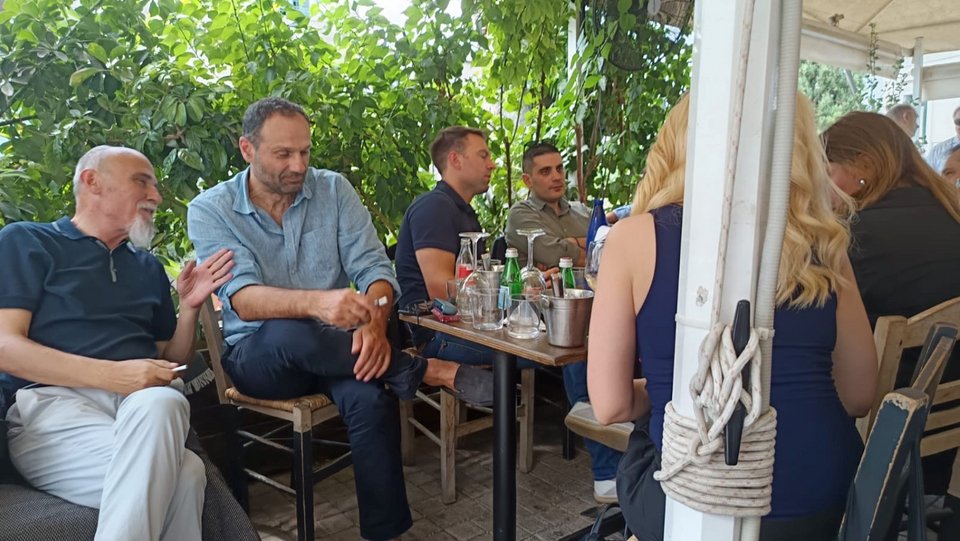 Στη συνέχεια, περπάτησε στον πεζόδρομο και κατευθύνθηκε σε γνωστό μαγαζί του Θησείου για aperitivo και πίτσα με τους πολιτικούς συντάκτες.