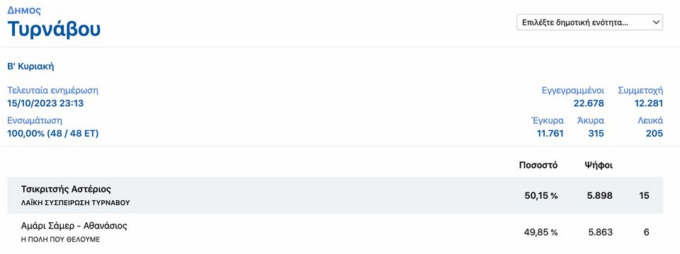 Τέλος, εκλογικό θρίλερ εκτυλίχθηκε και στον Δήμο Τυρνάβου, όπου ο Αστέριος Τσικριτσής επικράτησε του Σάμερ-Αθανάσιου Αμάρι για 35 ψήφους.
