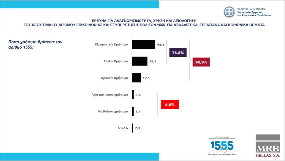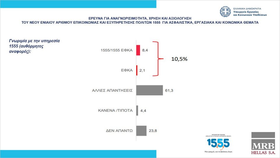 Το 1555, ο Ενιαίος Αριθμός Εξυπηρέτησης Πολιτών του υπουργείου Εργασίας και Κοινωνικών Υποθέσεων κερδίζει σταθερά την εμπιστοσύνη των πολιτών, οι οποίοι πλέον αναγνωρίζουν όχι μόνο την ύπαρξή του, αλλά και την αξία που προσθέτει στην καθημερινότητά τους. Αυτό επιβεβαιώνεται και από σχετική έρευνα της MRB Hellas, που πραγματοποιήθηκε στο διάστημα μεταξύ 17 – 19 Μαρτίου 2022, με τη μέθοδο των τηλεφωνικών συνεντεύξεων και δείγμα 1008 ατόμων.