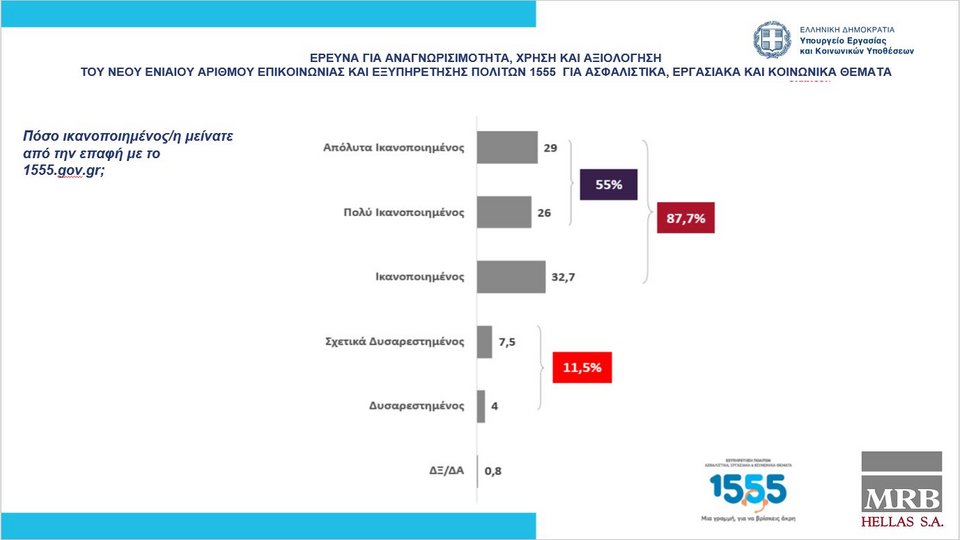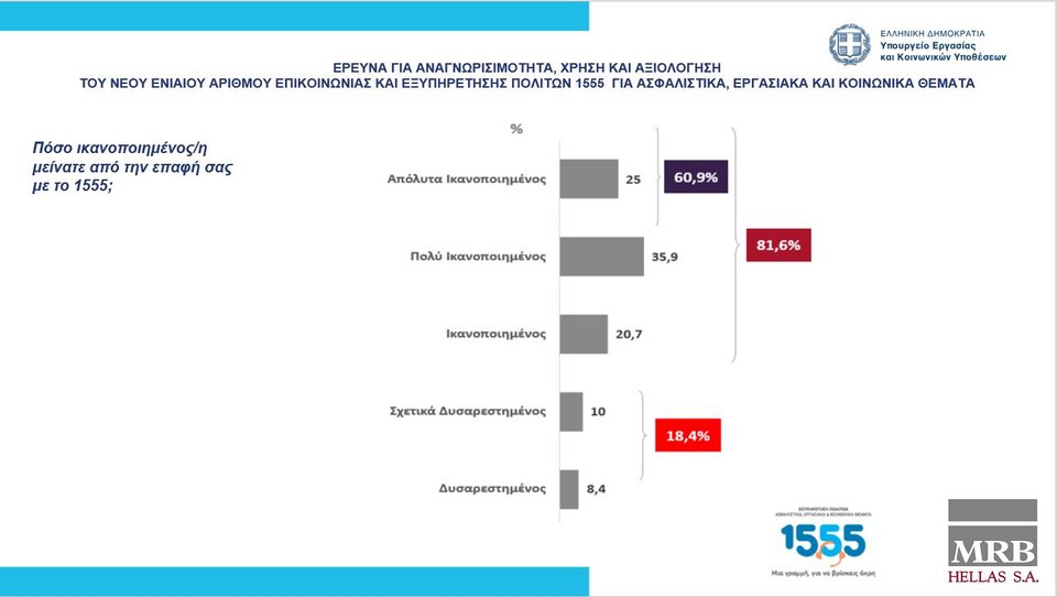 Εξίσου υψηλά είναι και τα ποσοστά ικανοποίησης των πολιτών, οι οποίοι έχουν κάνει χρήση της συγκεκριμένης υπηρεσίας. Το 21% των ερωτώμενων έχει επικοινωνήσει με το τηλεφωνικό κέντρο του 1555 και από αυτούς, οι 8 στους 10 έχουν καλέσει πάνω από μια φορά. Τα ασφαλιστικά θέματα είναι ο λόγος κλήσεις στις περισσότερες περιπτώσεις (61%), ενώ ακολουθούν τα κοινωνικά επιδόματα και τα εργασιακά θέματα. Το 61% των συμμετεχόντων που έχουν καλέσει στο 1555, δήλωσαν ότι είναι πολύ και αρκετά ικανοποιημένοι από την εξυπηρέτηση που έλαβαν. Εάν σε αυτούς προστεθούν και όσοι δήλωσαν «ικανοποιημένοι», το ποσοστό ικανοποίησης φθάνει στο 82%.