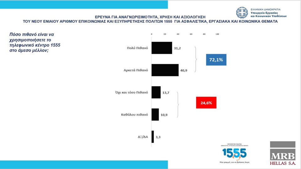 Τέλος, στη μεγάλη πλειονότητά τους, οι συμμετέχοντες δήλωσαν ότι είναι πιθανό να χρησιμοποιήσουν το 1555 στο μέλλον, με τα ποσοστά να φθάνουν στο 74% για την τηλεφωνική υπηρεσία και στο 69% για το portal.