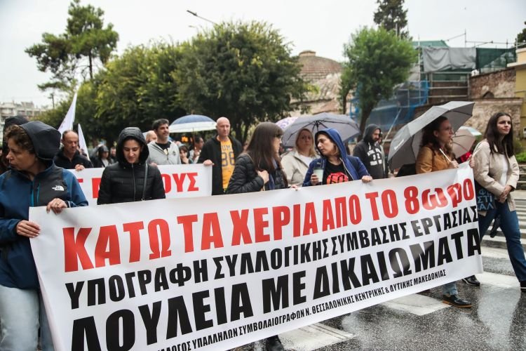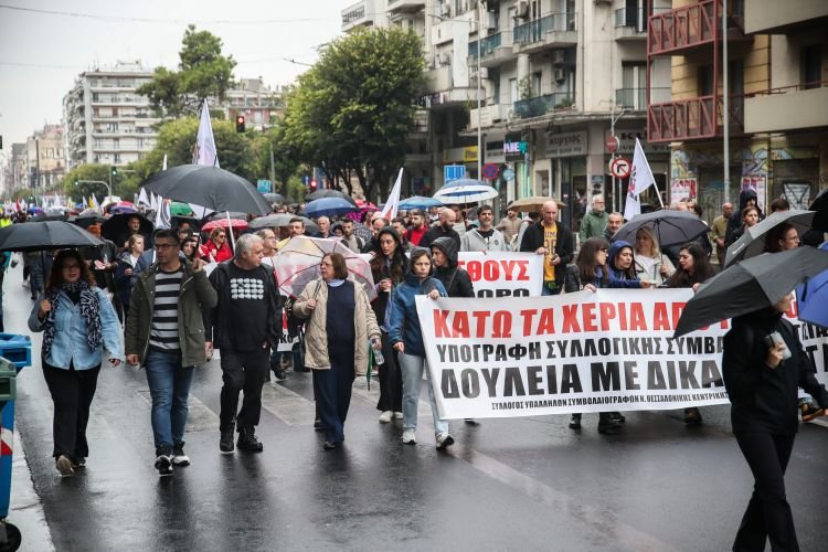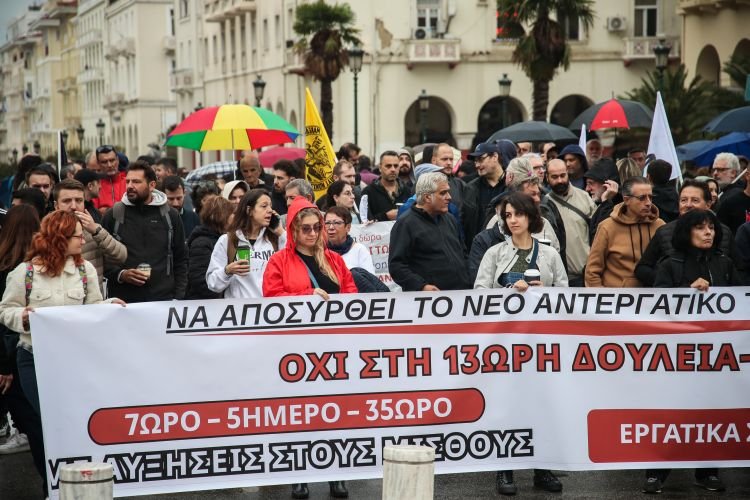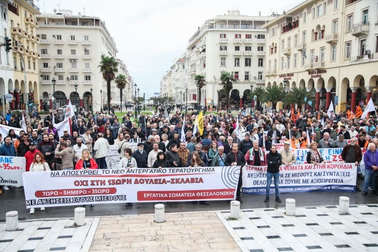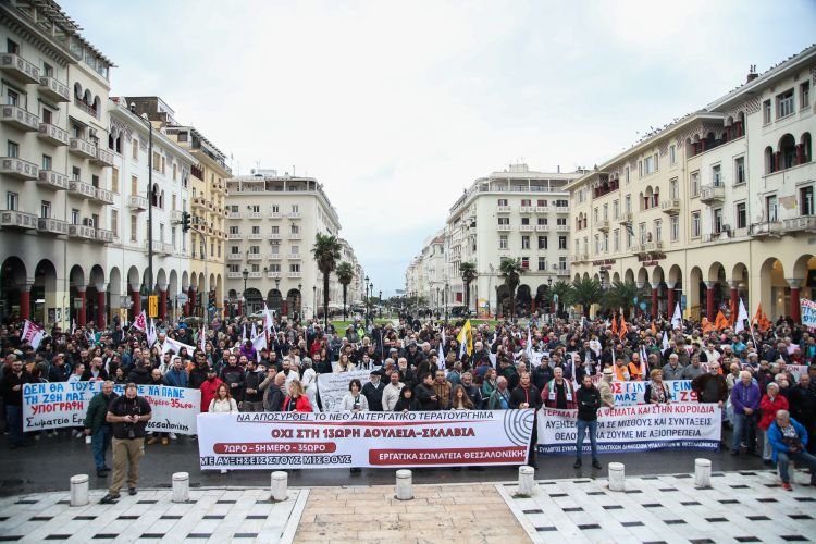 Με κύριο αίτημα την απόσυρση του εργασιακού νομοσχεδίου, στο επίκεντρο του οποίου βρίσκεται η 13ωρη εργασία, συνδικάτα, σωματεία και συλλογικότητες έχουν κατέβει στους δρόμους της Θεσσαλονίκης, διαδηλώνοντας στο πλαίσιο της 24ωρης απεργίας.