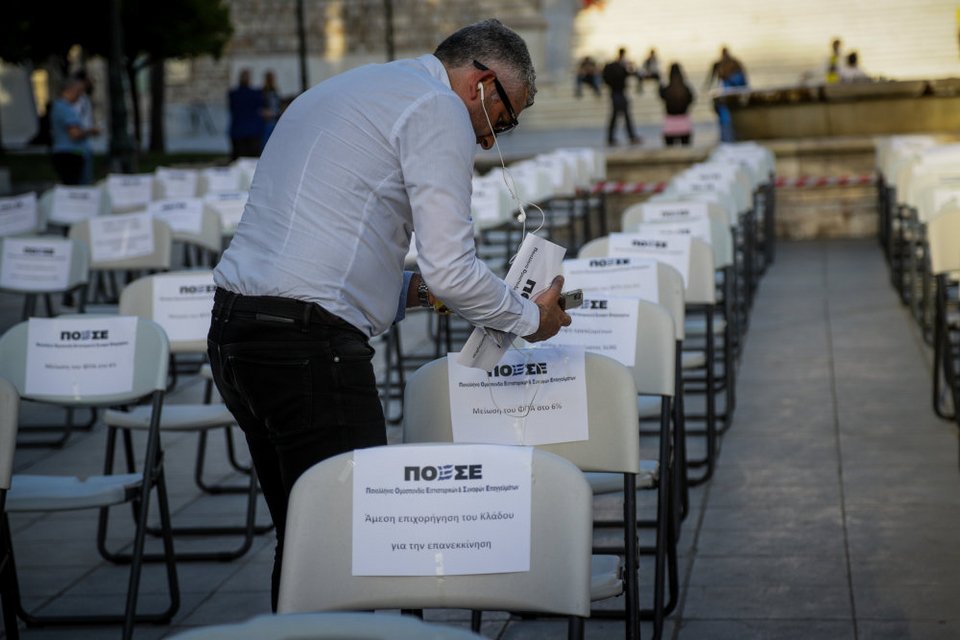 Στην πλάτη των άδειων καρεκλών, τα μέλη της ΠΟΕΣΕ είχαν κολλήσει φέιγ βολάν στα οποία αναγράφονταν συνθήματα και αιτήματά τους για την αντιμετώπιση της οικονομικής κρίσης που φέρνει η πανδημία τουκορωνοϊού.
