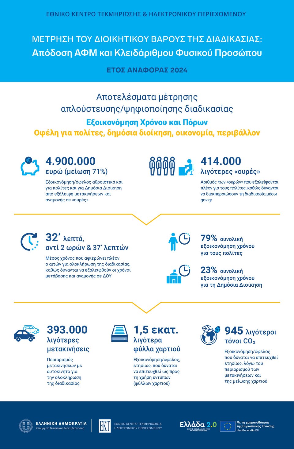 Περίπου 4,9 εκατ. ευρώ ετησίως εξοικονομήθηκαν για πολίτες και δημόσια διοίκηση, από εξάλειψη μετακινήσεων και αναμονής σε «ουρές» για ΑΦΜ.