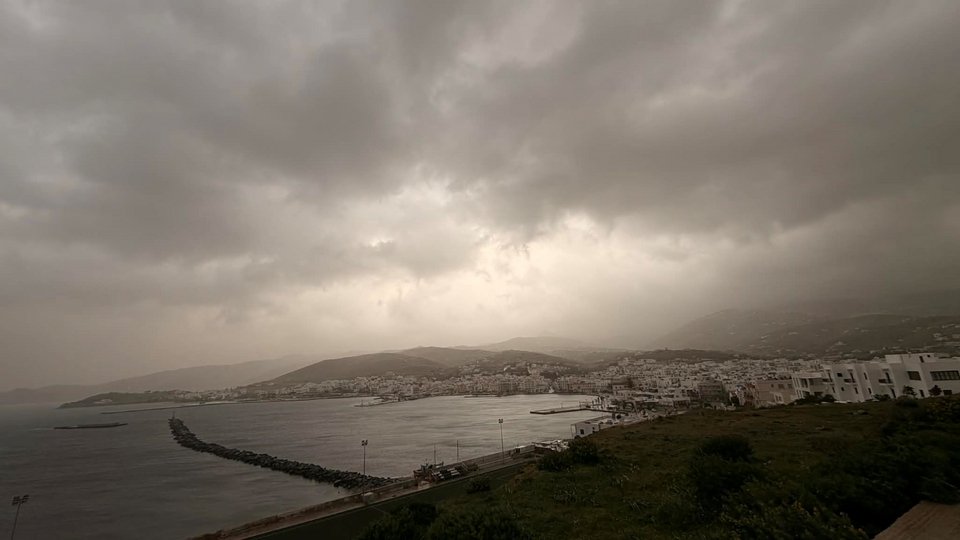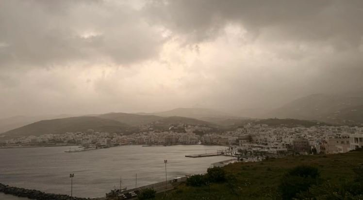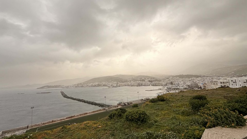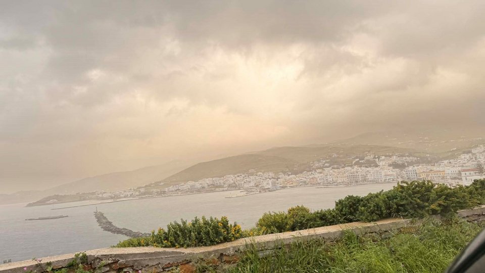 Η αφρικανική σκόνη στην ατμόσφαιρα, η οποία έχει δημιουργήσει δύσκολες συνθήκες σε πολλές περιοχές του νησιού. Οι ισχυροί νότιοι άνεμοι μεταφέρουν σημαντικές ποσότητες σκόνης, ενώ το φαινόμενο συνοδεύεται και από βροχοπτώσεις, επιβαρύνοντας περαιτέρω την καθημερινότητα των κατοίκων.