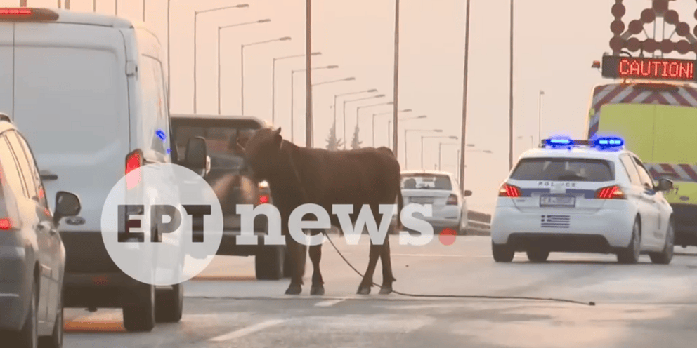 Σύμφωνα με την ΕΡΤ η νεαρής ηλικίας αγελάδα μπήκε αντίθετα στον αυτοκινητόδρομο και προκάλεσε κυκλοφοριακό χάος.