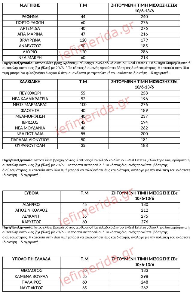 Συγκεκριμένα, στη Ραφήνα κατοικία 44 τ.μ. μισθώνεται προς 240€ για το τριήμερο, στο Πόρτο Ράφτη κατοικία 60 τ.μ. προς 276€, στην Αρτέμιδα κατοικία 40 τ.μ. προς 276€, στην Αγία Μαρίνα κατοικία 47 τ.μ. προς 216€, στην Ανάβυσσο κατοικία 50 τ.μ. προς 185€, στη Νέα Μάκρη κατοικία 60 τ.μ. προς 218€. Ακίνητα μεγαλύτερης επιφάνειας (120 τ.μ.) διατίθενται στη Βραυρώνα και στο Λαύριο, με συνολικό κόστος μίσθωσης για το τριήμερο 179€ και 286€ αντίστοιχα.