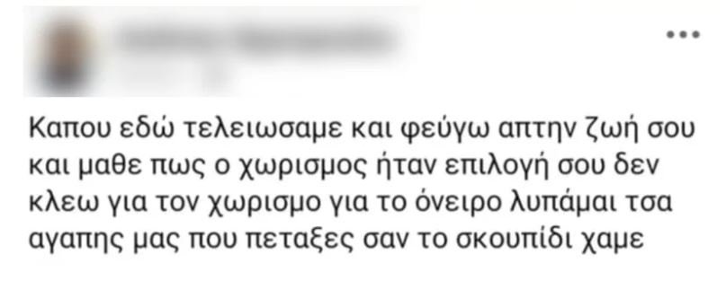 Σε μια από τις ανορθόγραφες αναρτήσεις του ο 30χρονος γράφει χαρακτηριστικά ότι «κάπου εδώ τελειώσαμε και φεύγω απ’ την ζωή σου και μάθε πως ο χωρισμός ήταν επιλογή σου», ενώ στην συνέχεια τόνισε ότι «δεν κλαίω για τον χωρισμό για το όνειρο λυπάμαι τσα αγάπης μας που πέταξες σαν το σκουπίδι χάμε».