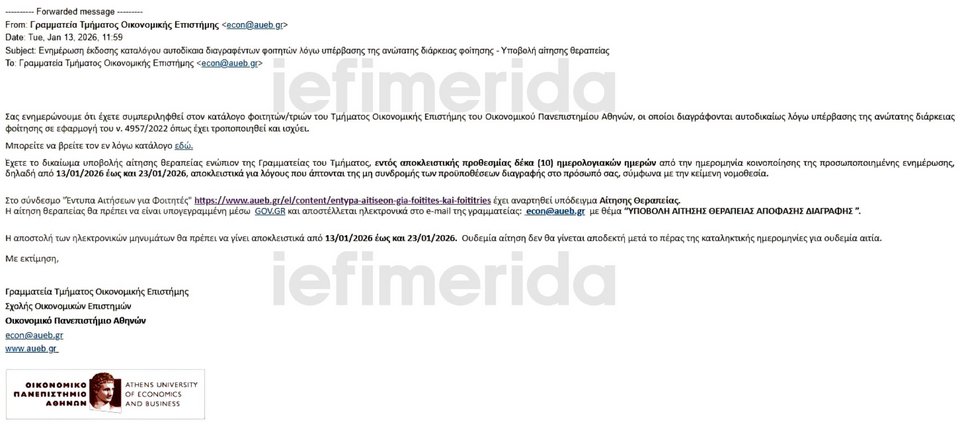 «Έχετε το δικαίωμα υποβολής αίτησης θεραπείας ενώπιον της Γραμματείας του Τμήματος, εντός αποκλειστικής προθεσμίας δέκα (10) ημερολογιακών ημερών από την ημερομηνία κοινοποίησης της προσωποποιημένης ενημέρωσης, δηλαδή από 13/01/2026 έως και 23/01/2026, αποκλειστικά για λόγους που άπτονται της μη συνδρομής των προϋποθέσεων διαγραφής στο πρόσωπό σας, σύμφωνα με την κείμενη νομοθεσία», αναφέρεται στο email του Οικονομικού Πανεπιστημίου Αθηνών.