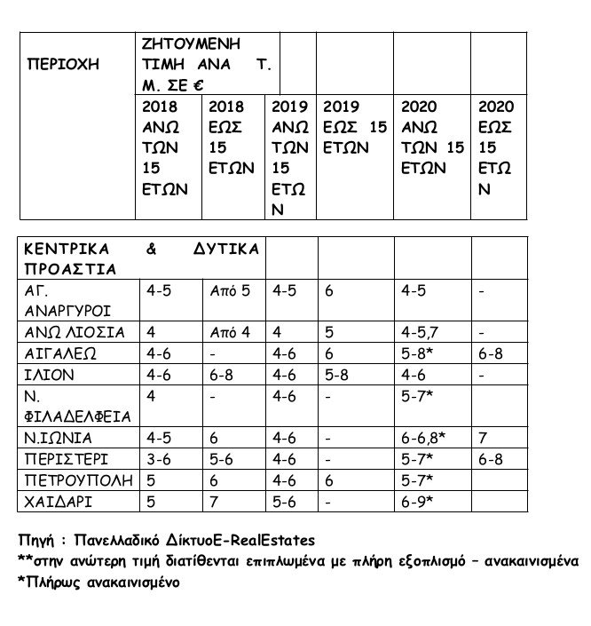 - Περιστέρι: Ικανοποιητικός αριθμός διαθέσιμων ακινήτων άνω των 15 ετών. Το μεγαλύτερο ποσοστό των διαθέσιμων ακινήτων άνω των 15 ετών, είτε είναι πλήρως ανακαινισμένα με έτος κατασκευής 1972-1990, είτε νεότερα ακίνητα κατασκευής 1995-2000. Περιορισμός στη διαθεσιμότητα ακινήτων έως 15 ετών.