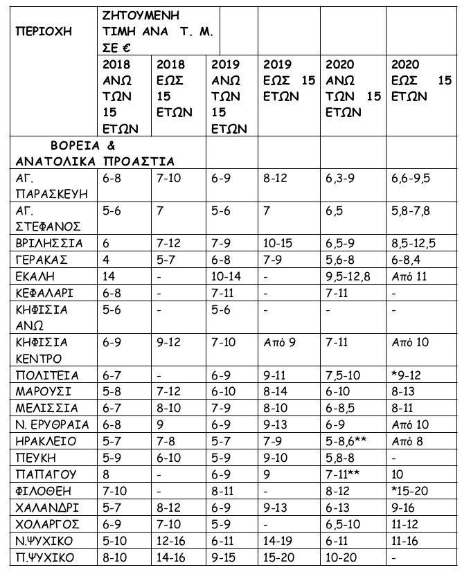 - Νέο Ψυχικό: Τα διαθέσιμα διαμερίσματα έως 15 ετών, στην ανώτερη ζητούμενη τιμή μίσθωσης, διατίθενται επιπλωμένα και πλήρως εξοπλισμένα. Τα ακίνητα άνω των 15 ετών που η ζητούμενη τιμή μίσθωσης κυμαίνεται μεταξύ 6€/τμ έως 8,2€/τμ , είναι κυρίως ακίνητα κατασκευής 1970-1985 που στην ανώτερη τιμή μίσθωσης, είναι κυρίως ακίνητα ανακαινισμένα. Τα ακίνητα άνω των 15 ετών που η ζητούμενη τιμή μίσθωσης κυμαίνεται από 9€/τμ έως 11€/τμ, είναι ακίνητα κατασκευής από το 1995 έως το 2000, πλήρως ανακαινισμένα και σε μεγάλο ποσοστό μισθώνονται επιπλωμένα με το σύνολο του εξοπλισμού.