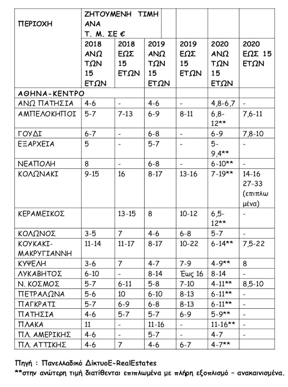 - Εξάρχεια : Τα ακίνητα άνω των 15 ετών που η ζητούμενη τιμή μίσθωσης κυμαίνεται μεταξύ 5€/τμ έως 6,8€/τμ , είναι κυρίως ακίνητα κατασκευής 1965-1978 μη ανακαινισμένα πλήρως (κουζίνα ή/και μπάνιο), με ζητούμενη τιμή μίσθωσης μεταξύ 7,6€/τμ έως 9,4€/τμ είναι ακίνητα κατασκευής 1970-1985 πλήρως ανακαινισμένα και μερικά μερικώς εξοπλισμένα.