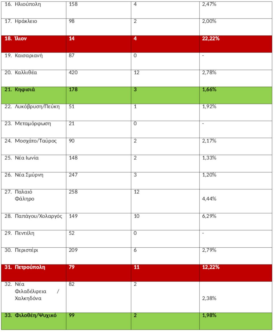 Στο σύνολο των 35 περιοχών της Αττικής, τα νεόδμητα ακίνητα αποτελούν μόλις το 3,18% επί του συνόλου των μεταβιβάσεων σύμφωνα με το μητρώο αξιών μεταβιβάσεων για το 2023. Στον Δήμο Αθηναίων μόλις το 1,75% των μεταβιβάσεων αφορούσαν κατοικίες κατασκευής μετά το 2018 και σε απόλυτους αριθμούς μόλις 83. Τα υψηλότερα ποσοστά μεταβιβάσεων νεόδμητων ακινήτων καταγράφονται στο Ίλιον (22%), στον Άλιμο (16,41%), στα Βριλήσσια (14,29%), στο Ελληνικό/Αργυρούπολη (13%) και στην Πετρούπολη (12,22%). Τα μικρότερα ποσοστά μεταβιβάσεων νεόδμητων ακινήτων εκτός από τον Δήμο Αθηναίων καταγράφονται στο Αιγάλεω (1,67%), στο Γαλάτσι (1,22%), στου Ζωγράφου (1,52%), στην Κηφισιά (1,66%), στη Φιλοθέη/Ψυχικό (1,98%) και στο Χαϊδάρι (1,39%).