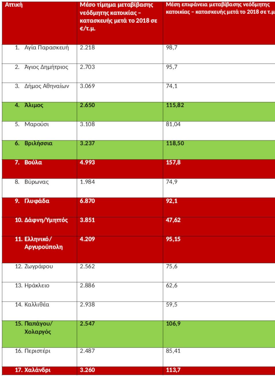 Με δεδομένα από το μητρώο αξιών μεταβιβάσεων ακινήτων, στον Δήμο Αθηναίων το μέσο τίμημα μεταβίβασης νεόδμητης κατοικίας, κατασκευής μετά το 2018, ανέρχεται στις 3.069€ και με μέση επιφάνεια τα 74,1 τ.μ.. Το υψηλότερο μέσο τίμημα μεταβίβασης νεόδμητης κατοικίας κατασκευής μετά το 2018 καταγράφεται στη Γλυφάδα και ανέρχεται στις 6.870€/τ.μ. και με μέση επιφάνεια 92,1 τ.μ., στη Βούλα στις 4.993 €/τ.μ. και με μέση επιφάνεια 157,8 τ.μ., στο Ελληνικό/Αργυρούπολη στις 4.209€/τ.μ. και με μέση επιφάνεια 95,15 τ.μ., στη Δάφνη/Υμηττός στις 3.851€/τ.μ. και με μέση επιφάνεια 47,62 τ.μ. και στο Χαλάνδρι στις 3.260€/τ.μ. και με επιφάνεια 113,7 τ.μ.