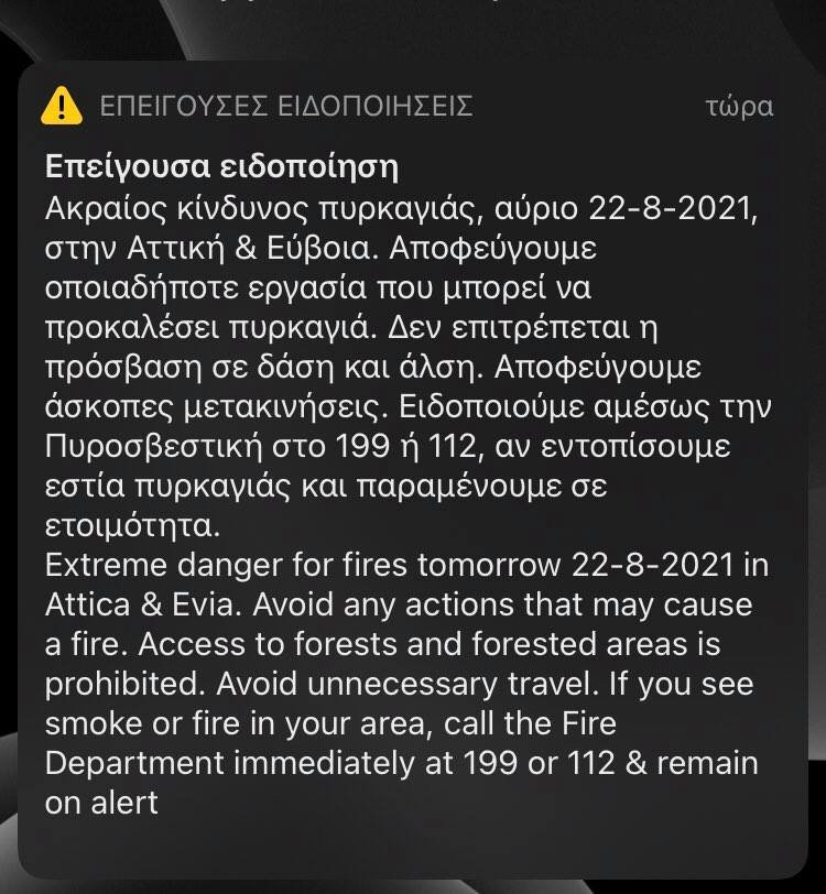 Μάλιστα, μετά τις 14:00 εστάλη και μήνυμα 112 προς τους κατοίκους των περιοχών αυτών που ανέφερε: ΠPOΣOXH! KATAΣTAΣH ΣYNAΓEPMOY ΣE ATTIKH & EYBOIA & ΠOΛY YΨHΛOΣ KINΔYNOΣ ΠYPKAΓIAΣ ΣE ΠOΛΛEΣ ΠEPIOXEΣ AYPIO 22 AYΓOYΣTOY - AΠAITEITAI IΔIAITEPH ΠPOΣOXH & EΠAΓPYΠNHΣH AΠO OΛOYΣ!
