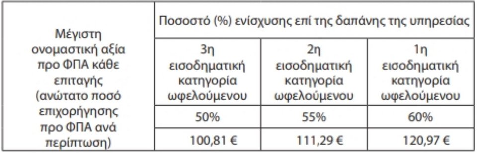 - αφενός το γινόμενο του ποσοστού ενίσχυσης που αντιστοιχεί στη εισοδηματική κατηγορία του ωφελούμενου επί την τιμή αγοράς/υπηρεσίας,
