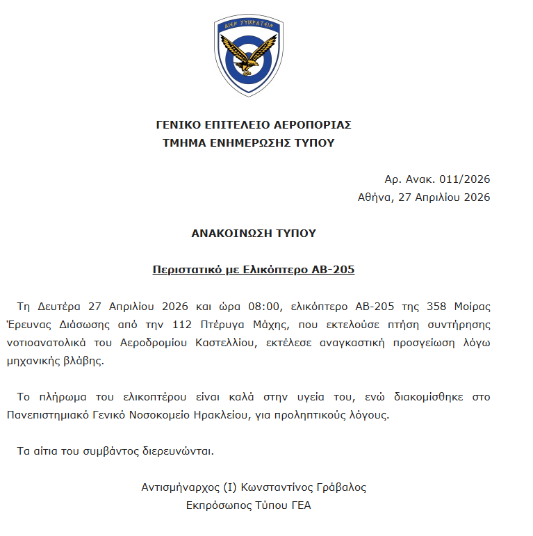 «Τη Δευτέρα 27 Απριλίου 2026 και ώρα 08:00, ελικόπτερο ΑΒ-205 της 358 Μοίρας Έρευνας Διάσωσης από την 112 Πτέρυγα Μάχης, που εκτελούσε πτήση συντήρησης νοτιοανατολικά του Αεροδρομίου Καστελλίου, εκτέλεσε αναγκαστική προσγείωση λόγω μηχανικής βλάβης.