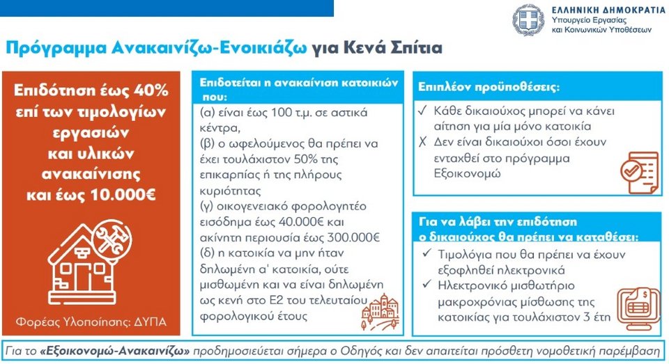 Ένα από τα σκέλη του στρατηγικού σχεδίου για τη στέγαση «Σπίτι μου» είναι ένα νέο πρόγραμμα, το «Ανακαινίζω-Ενοικιάζω».
