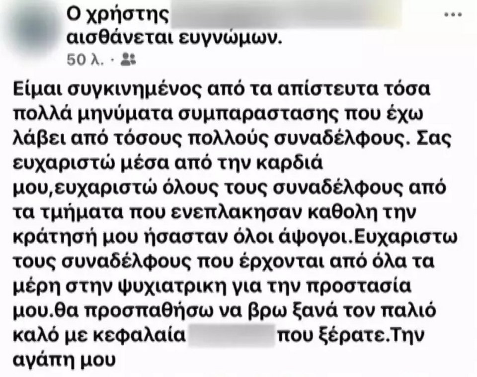 Ευχαριστώ τους συναδέλφους που έρχονται από όλα τα μέρη στην ψυχιατρική για την προστασία μου. Θα προσπαθήσω να βρω ξανά τον παλιό καλό με κεφαλαία… που ξέρατε. Την αγάπη μου», έγραψε αρχικά στα social media, θέλοντας να εκφράσει την «ευγνωμοσύνη» του.
