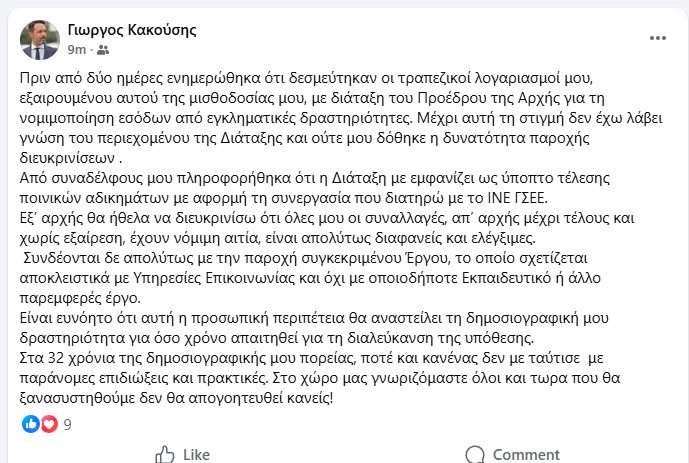 O δημοσιογράφος στην ανάρτησή του αναφέρει ότι πριν από δύο ημέρες ενημερώθηκε πως δεσμεύτηκαν οι τραπεζικοί του λογαριασμοί και ενημερώθηκε από συναδέλφους του δημοσιογράφους ότι η Διάταξη του Χαράλαμπου Βουρλιώτη τον εμφανίζει ως ύποπτο με αφορμή τη συνεργασία του με το ΙΝΕ ΓΣΕΕ.