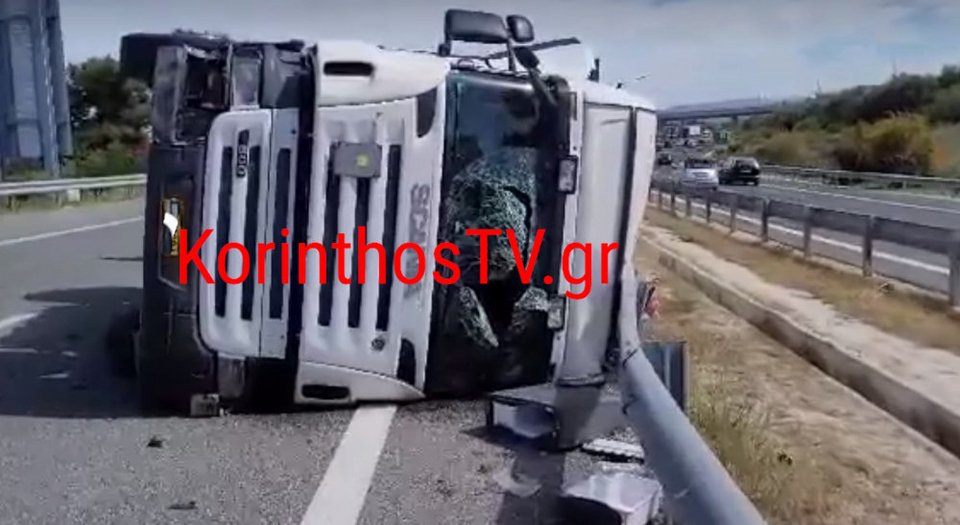 Νταλίκα εξετράπη της πορείας της και ανετράπη στο 101ο χιλιόμετρο της εθνικής οδού Κορίνθου-Πατρών.