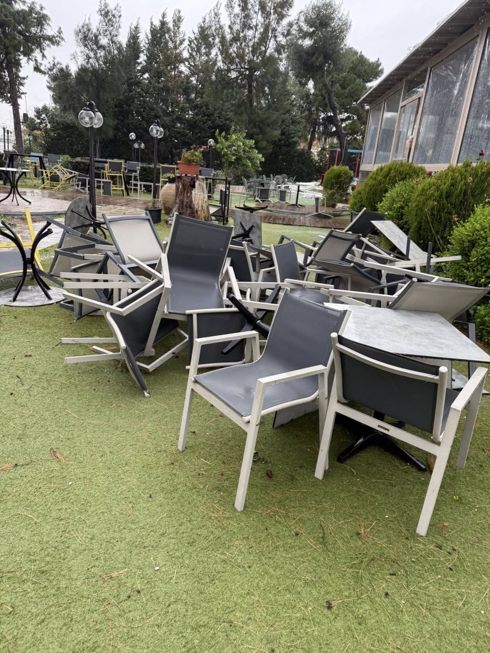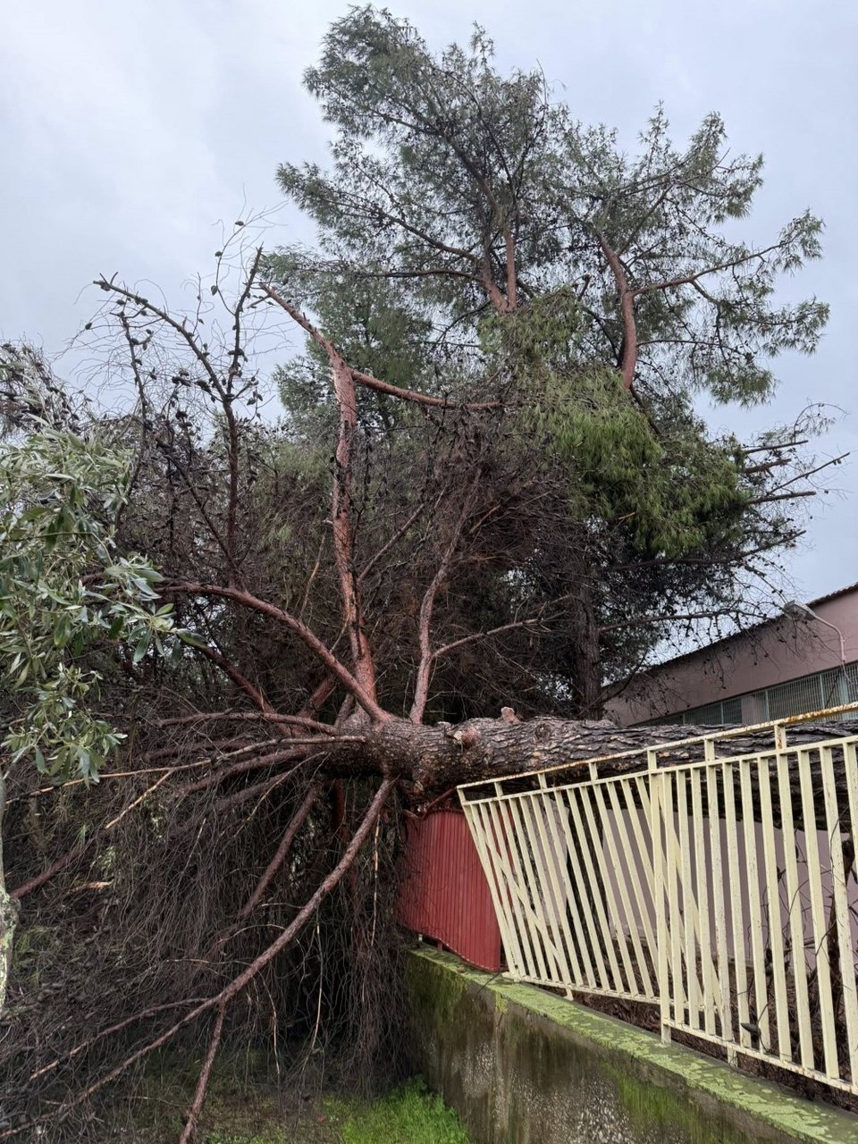 Ο αέρας ξήλωσε δέντρα, στέγες και μεγάλες μεταλλικές κατασκευές, με χαρακτηριστικό παράδειγμα μεγάλη τσίγκινη πέργκολα, η οποία παρασύρθηκε, έπεσε πάνω σε ευκάλυπτο και στη συνέχεια κατέληξε στη μέση του δρόμου, δημιουργώντας σοβαρό κίνδυνο.