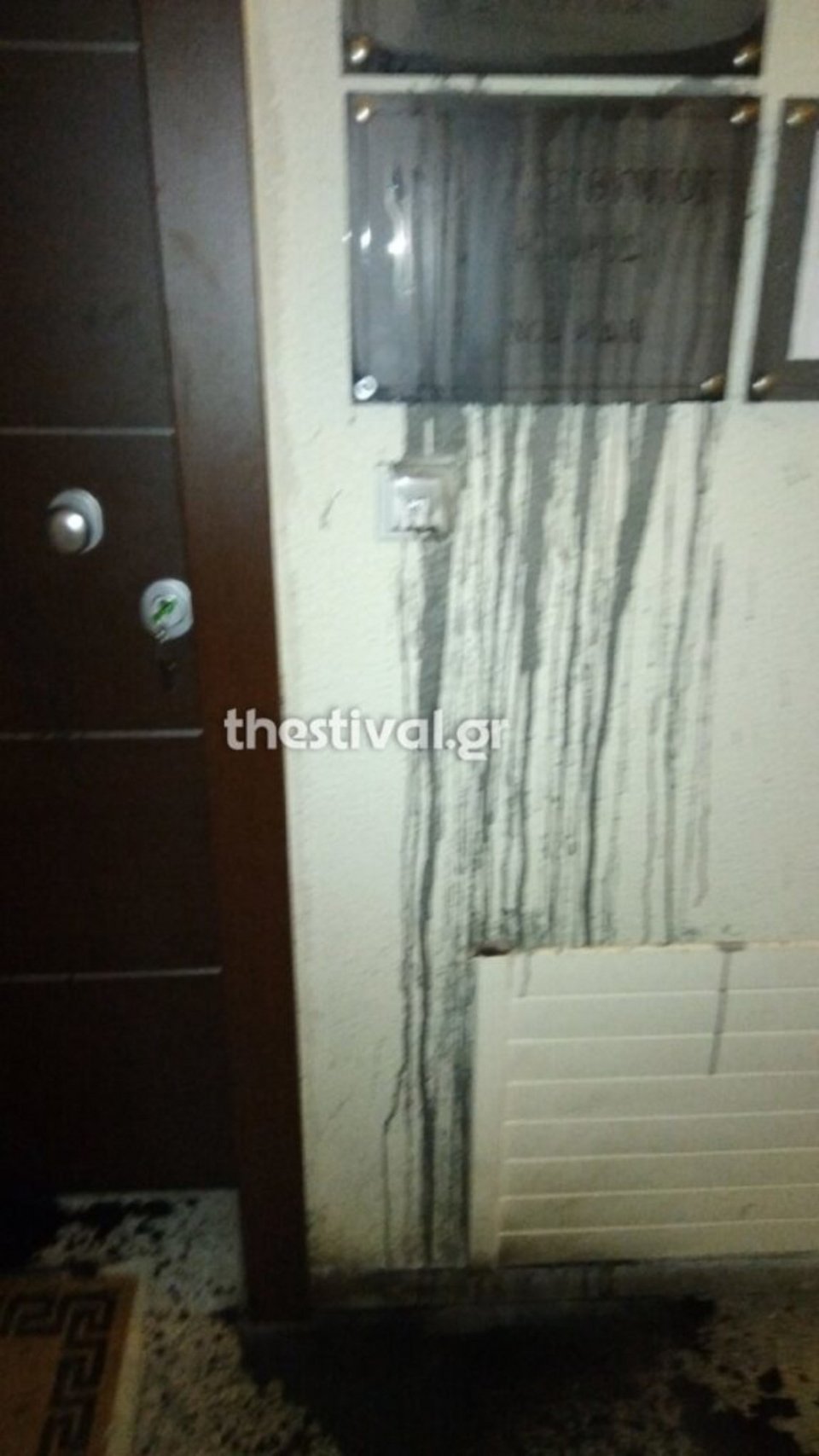 Οι άγνωστοι μπήκαν στην πολυκατοικία, πέταξαν μπογιές στην είσοδο του γραφείου και τράπηκαν σε φυγή.