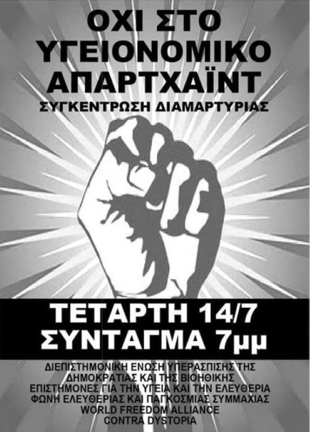 Ενα από τα καλέσματα, ωστόσο, φαίνεται πως έχει σχέση με τον χώρο της εξωκοινοβουλευτικής αριστεράς. «Οχι στο υγειονομικό απαρτχάιντ» επισημαίνεται στην αφίσα, την οποία υπογράφουν οι:
