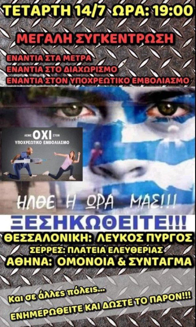 Μια από τις βασικές συγκεντρώσεις που θα πραγματοποιηθούν θα γίνει στις 19:00 της Τετάρτης, στο Σύνταγμα, μια ημέρα μετά τις ανακοινώσεις για τον υποχρεωτικό εμβολιασμό και τα μέτρα για τους κλειστούς χώρους. «Ενάντια στα μέτρα, ενάντια στο διαχωρισμό, ενάντια στον υποχρεωτικό εμβολιασμό. Ήλθε η ώρα μας! Ξεσηκωθείτε!» αναφέρει μια αφίσα που κυκλοφορεί στο διαδίκτυο. Το κάλεσμα είναι για Σύνταγμα, Ομόνοια, Λευκό Πύργο και πλατεία Ελευθερίας στις Σέρρες.