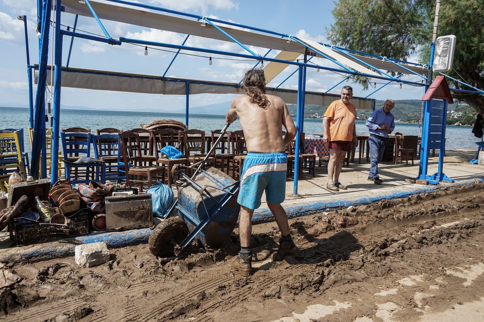 Οι ντόπιοι με φτυάρια και σκούπες στα χέρια -και άλλοι με καρότσια- αφαιρούν τα ορμητικά λασπόνερα που εισέβαλαν στο χωριό και κατέστρεψαν σπίτια, επιχειρήσεις και ότι άλλο μπορεί να φανταστεί ο ανθρώπινος νους.