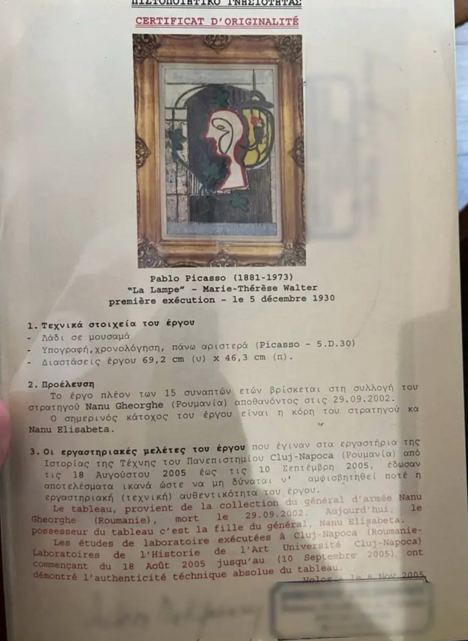 Για τους πίνακες που βρέθηκαν στην Αττική παραγγέλθηκε πραγματογνωμοσύνη και προέκυψε ότι ήταν εξ ολοκλήρου πλαστοί, κατ’ απομίμηση του καλλιτεχνικού ιδιώματος των ζωγράφων στους οποίους αποδίδονται, ενώ και οι υπογραφές που έφεραν ήταν πλαστές, ομοίως κατ’ απομίμηση των υπογραφών των ζωγράφων που φέρονται ότι τους δημιούργησαν.