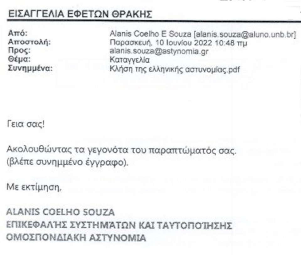 Η συγκεκριμένη επιστολή διακινείται μέσω email, στο οποίο ως αποστολέας εμφαίνεται ο «ALANIS COELHO SOUZA», με φερόμενο τίτλο «ΕΠΙΚΕΦΑΛΗΣ ΣΥΣΤΗΜΑΤΩΝ ΚΑΙ ΤΑΥΤΟΠΟΙΗΣΗΣ», προερχόμενος από την «ΟΜΟΣΠΟΝΔΙΑΚΗ ΑΣΤΥΝΟΜΙΑ».