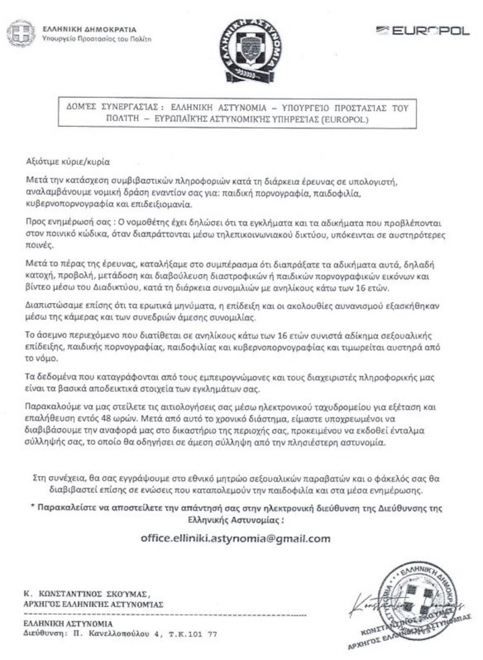 Πλέον, στην προσπάθειά τους να εξαπατήσουν χρήστες του διαδικτύου, οι επιτήδειοι χρησιμοποιούν και τα στοιχεία του αρχηγού της Ελληνικής Αστυνομίας, αντιστράτηγου Κωνσταντίνου Σκούμα, σε επιστολή που φέρει τα λογότυπα του υπουργείου Προστασίας του Πολίτη, της Ελληνικής Αστυνομίας και της Europol, υπογραφή με στρογγυλή σφραγίδα και άλλα στοιχεία (π.χ. email), που δημιουργούν την εντύπωση ότι προέρχεται από την Ελληνική Αστυνομία.