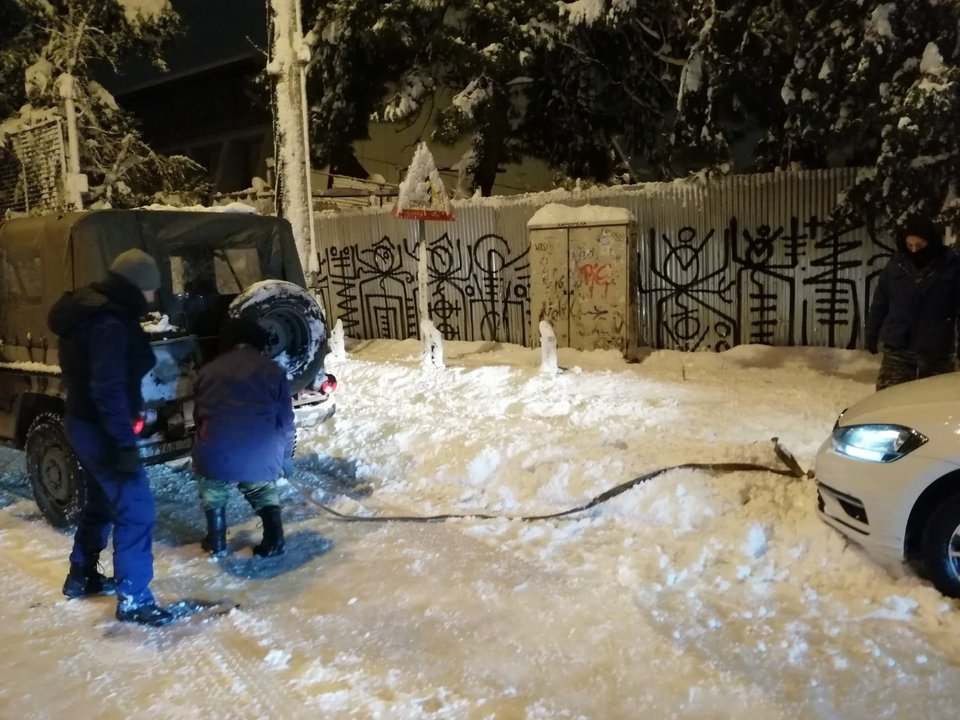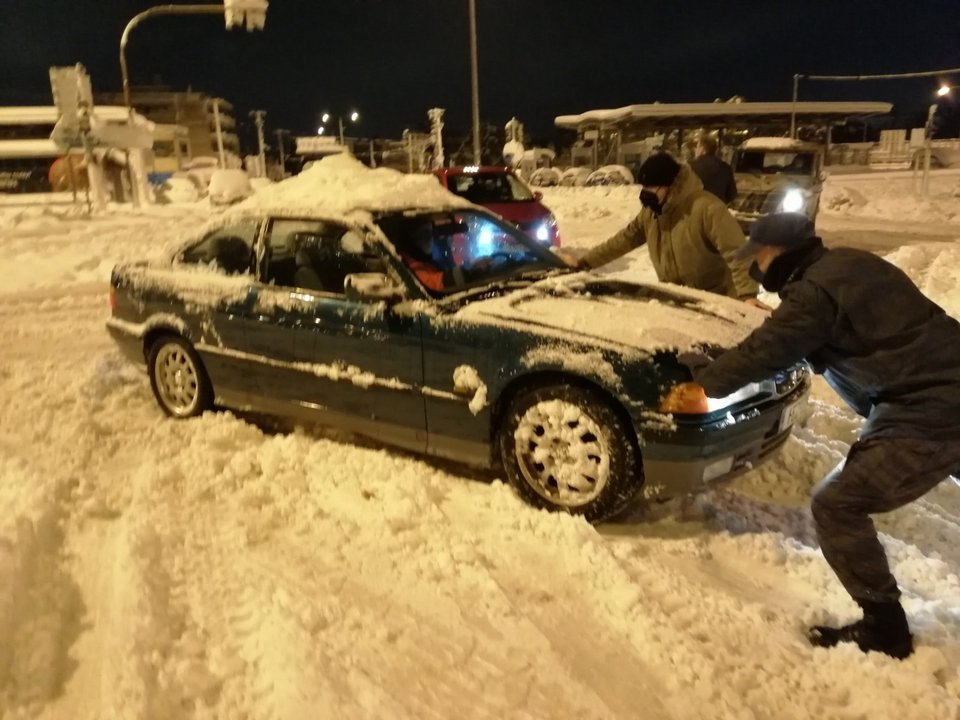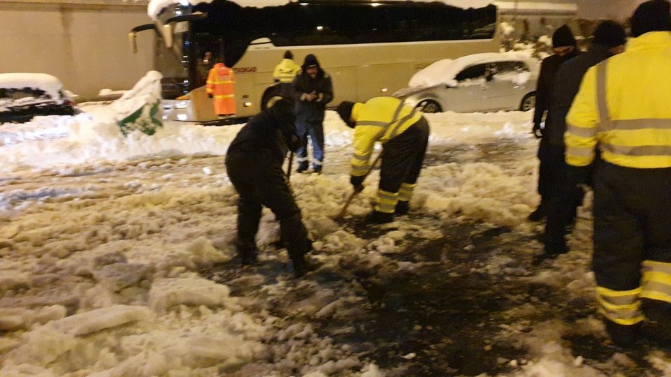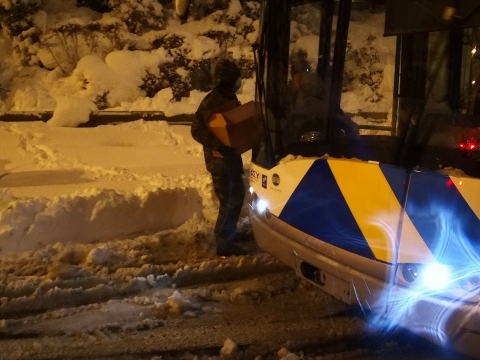 Ακόμα και με φτυάρια προσπάθησαν να καθαρίσουν το οδόστρωμα και στη συνέχεια να βοηθήσουν τα αυτοκίνητα να κάνουν αναστροφή για να απεγκλωβιστούν.